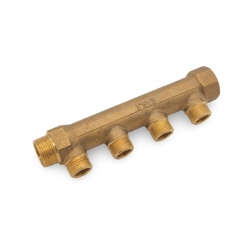 Коллектор 3/4" - Т4 - 1/2" Н представляет собой патрубок, оснащенный боковыми отводами с наружной резьбой. Отводы расположены на стандартном межосевом расстоянии друг от друга перпендикулярно оси самого патрубка. Коллектор необходим для подключения различной запорной арматуры и распределения основного потока носителя на несколько направлений с равным давлением. Коллектор выполнен из латуни ЛС 59-1. Это прочный и устойчивый к коррозии материал, обеспечивающий длительный срок эксплуатации трубопроводной системы.