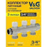 Коллектор 3/4" x 3 выхода 3/4" Евроконус с ручной регулировкой V&G VALOGIN / Распределительная гребенка латунная на 3 контура для системы отопления, горячей и холодной воды, VG-901502