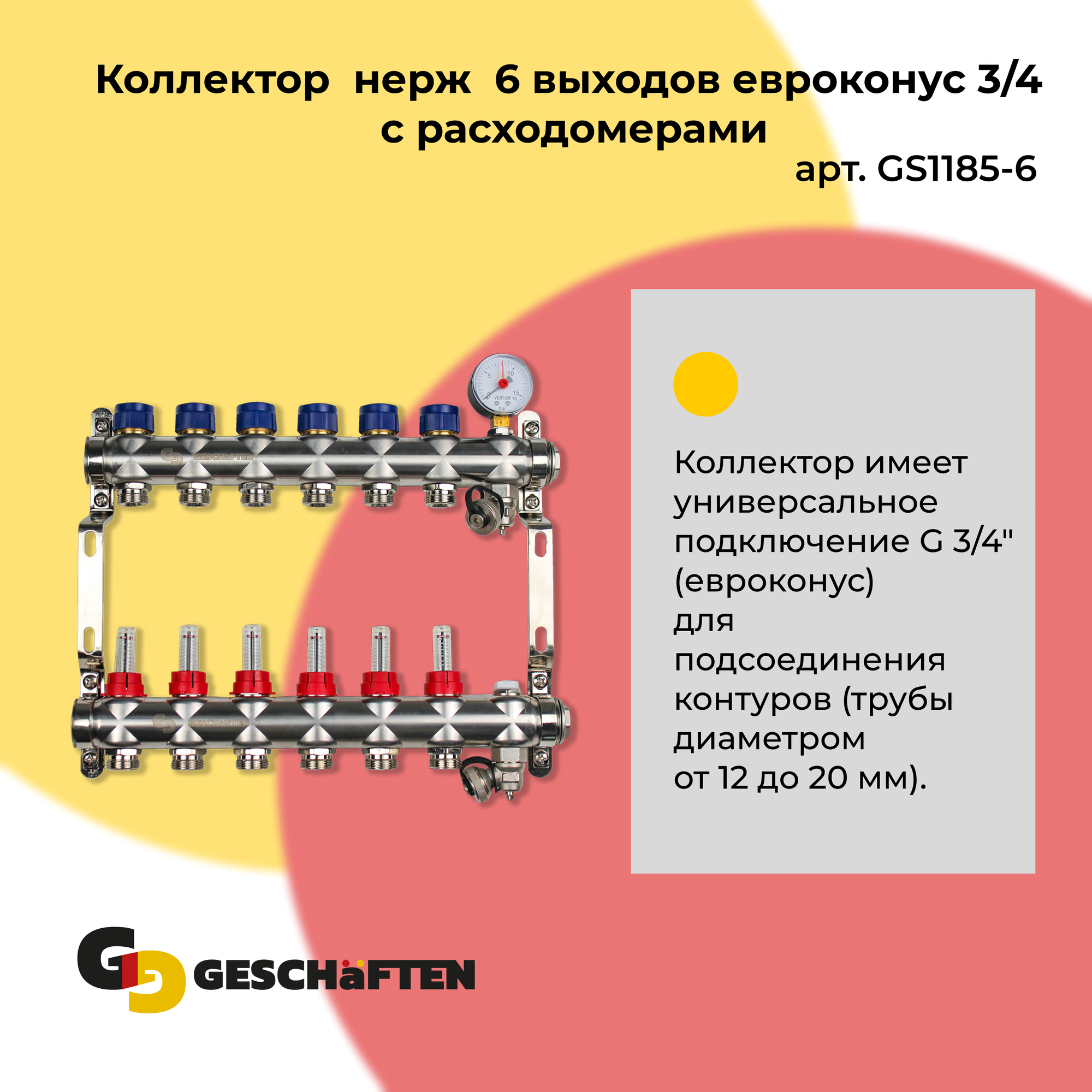 Коллектор с расходомерами для теплого пола из нержавеющей стали на 6 выходов евроконус 3/4 Geschaften: сравнение цен, характеристики, фото, актуальное наличие и цены.