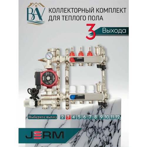 Коллектор для теплого пола JERM Коллектор с расходомерами на 3 контура. Смесительный узел от 20-60С. Циркуляционный насос 25/60. До 50кв/м.: сравнение цен, характеристики, фото, актуальное наличие и цены.