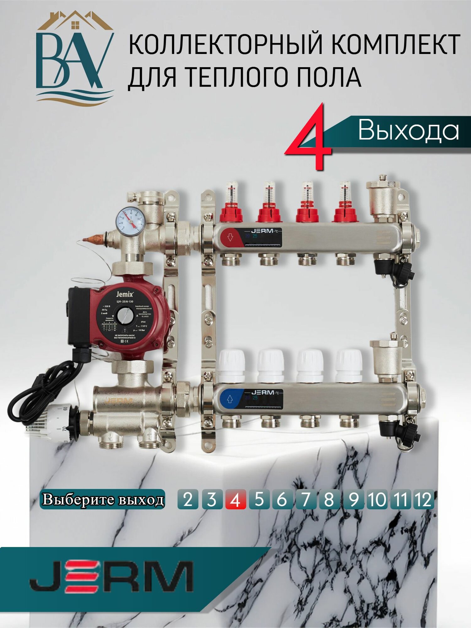 Коллектор для теплого пола JERM Коллектор с расходомерами на 4 контура. Смесительный узел от 20-60С. Циркуляционный насос 25/60. До 60кв/м.: сравнение цен, характеристики, фото, актуальное наличие и цены.