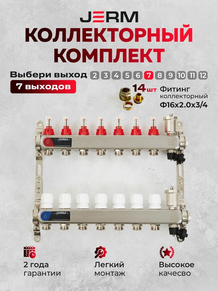 Коллектор для теплого пола JERM Коллектор с расходомерами на 7 контуров. Евроконусы(Гайки) 16х2,0х3/4. До 90кв/м.: сравнение цен, характеристики, фото, актуальное наличие и цены.