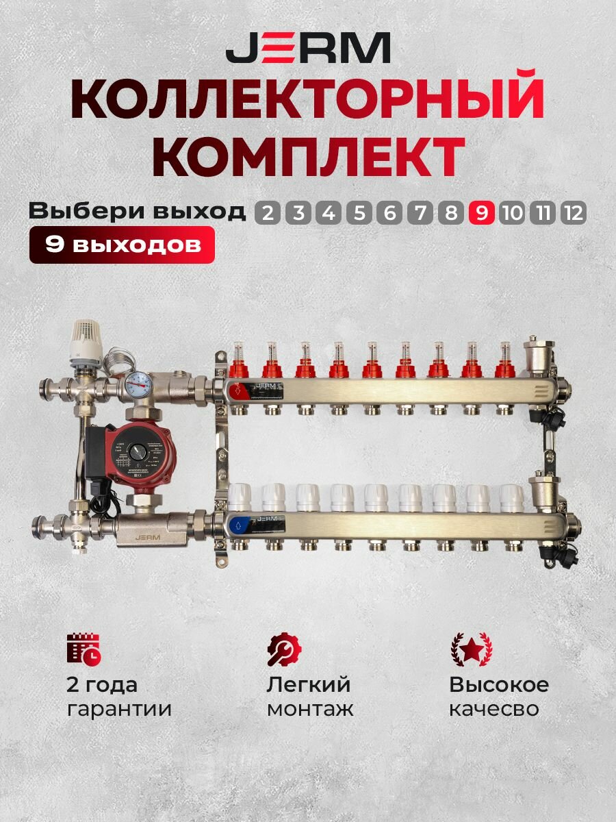 Коллектор для теплого пола JERM Коллектор с расходомерами на 9 контуров. Смесительный узел JERM JR-007039. Циркуляционный насос 25/60. До 110кв/м.: сравнение цен, характеристики, фото, актуальное наличие и цены.