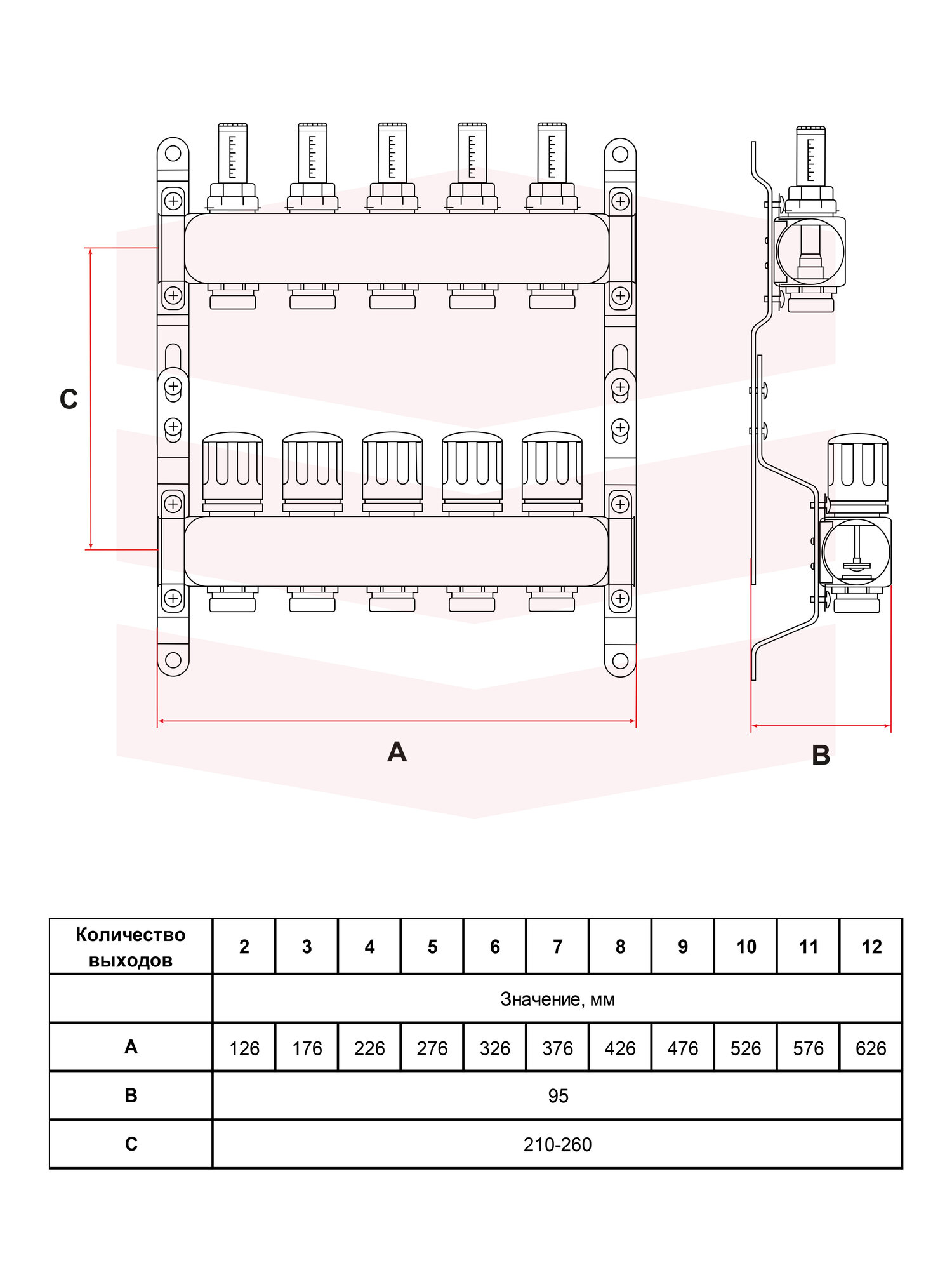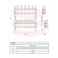 Коллектор имеет двенадцать выходов с наружной резьбой 3/4 дюйма и внутренним диаметром 20 мм, что позволяет подключать различные элементы системы отопления. Максимальное рабочее давление составляет 10 бар, а максимальная рабочая температура воды – 95 градусов.