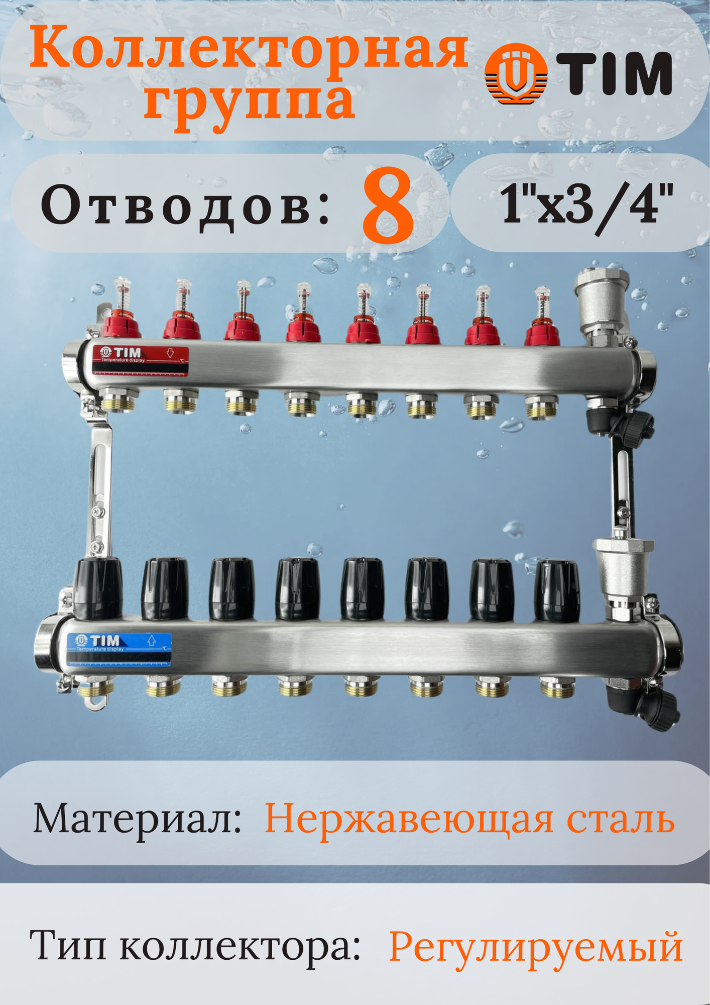 Коллектор для теплого пола с расходомерами 1″х 3/4″на 8 выходов , нерж, без кранов TIM: сравнение цен, характеристики, фото, актуальное наличие и цены.
