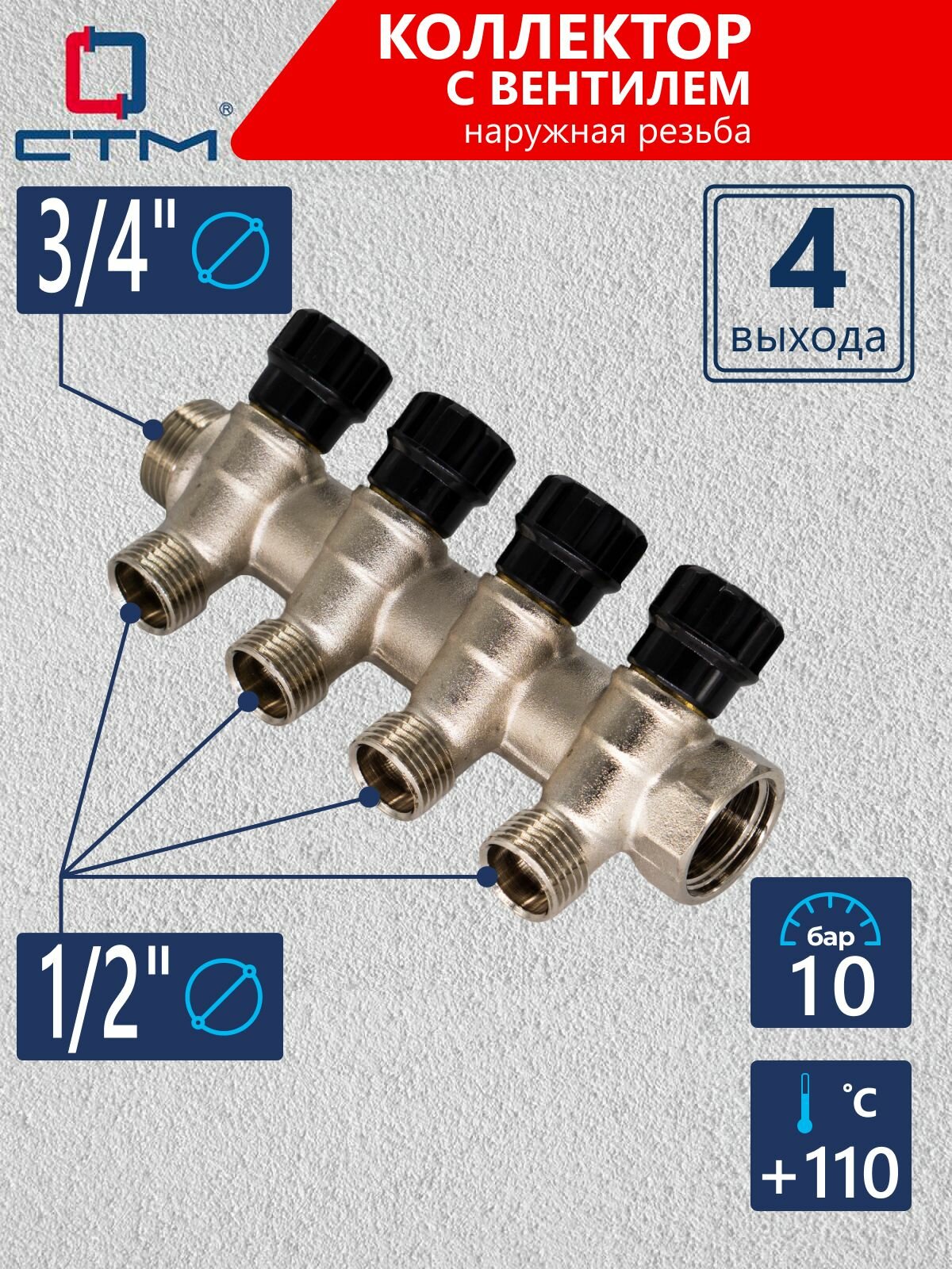Коллектор для труб СТМ 4 выхода наружная резьба 3/4″х1/2″, вентиль C4MV3412N: сравнение цен, характеристики, фото, актуальное наличие и цены.