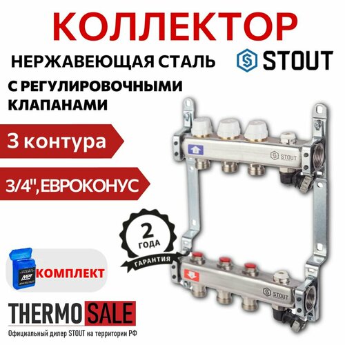 Купить STOUT Коллектор из нержавеющей стали без расходомеров, с клапаном вып. воздуха и сливом 3 вых. с доставкой по всей России.