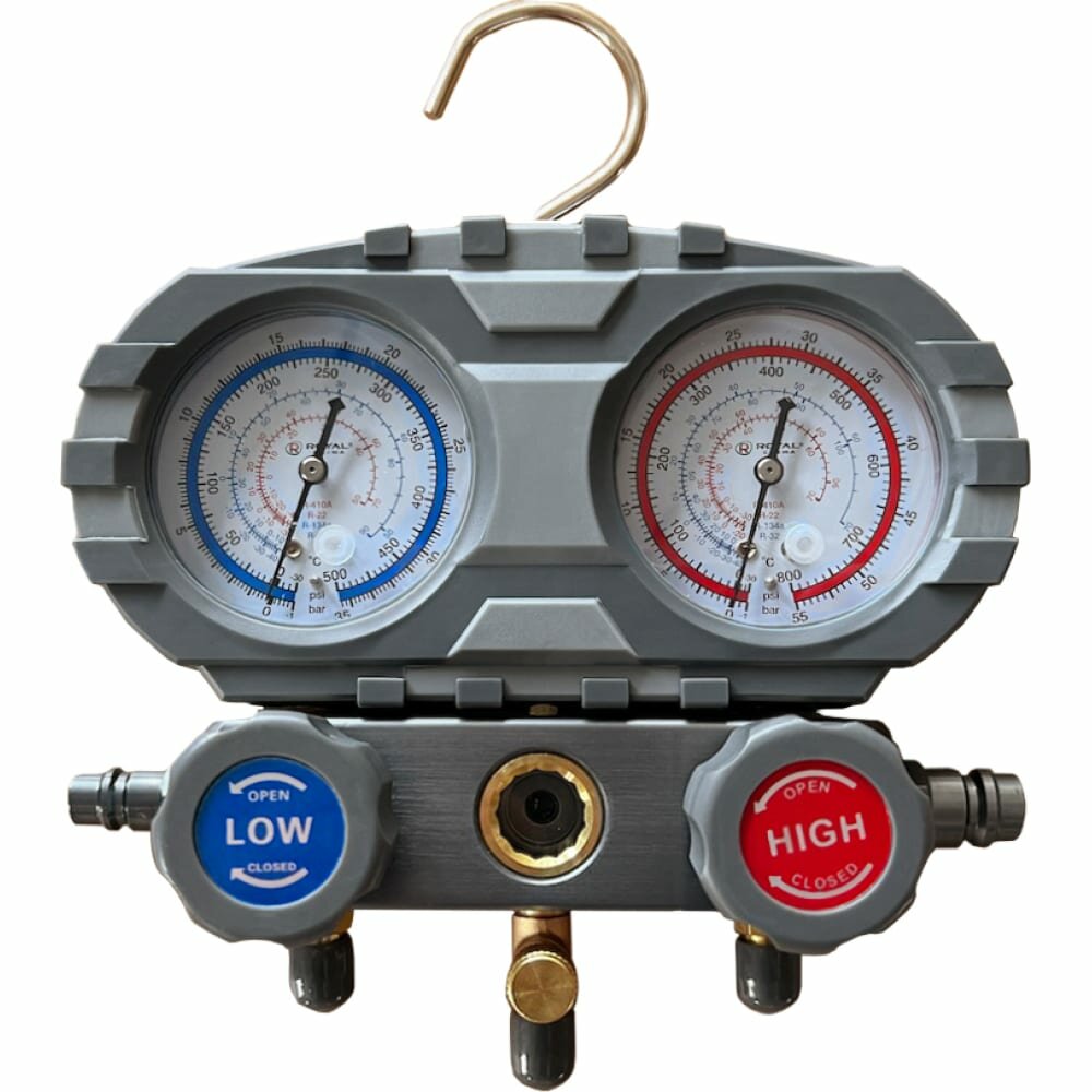 Манометрические коллекторы служат для контроля давления в холодильном контуре. С их помощью производится вакуумирование и заправка хладагентом. Для каждого хладагента нанесена отдельная шкала давления, по внешнему краю нанесена шкала для вакуумирования в bar и psi. Для обслуживания бытовых сплит-систем достаточно одновентильного манометра, так как данные системы имеют только один сервисный порт на стороне низкого давления. Для промышленных и автокондиицонеров представлены двухвентильные модели. Широкий модельный ряд позволяет подобрать манометрический коллектор как для бытового, так и для профессионального использования.