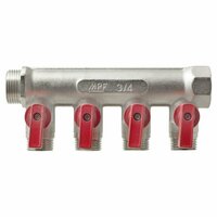Коллектор с отсекающими кранами используется в системах хол/гор водоснабжения, водяного радиаторного или напольного отопления для распределения и регулирования потоков жидкостей в системе, т. е. происходит равномерное распределение воды от трубопровода (стояка) к различным сантехническим приборам: унитазу, смесителям, душевой кабине, стиральной машине и т. д. Коллектора имеют различное количество выходов (отводов) в зависимости от своей конфигурации, на каждом из которых установлен отсекающий кран, позволяющий открывать и закрывать водяной поток на каждой отдельной ветке, но не имеет возможности регулировать расход водяного потока на каждом отдельном отводе. Коллектор имеет выходы под евроконус, что позволяет использовать его с м/п трубами. Евроконус покупается отдельно. Коллектор подходит для использования в системах питьевого водоснабжения благодаря минимальному содержанию свинца в сплаве, а также в других средах, неагрессивных к материалам производителя. Для защиты от коррозии и придания изделию эстетичного вида как на наружную, так и на внутреннюю поверхности коллектора нанесено гальваническое никелевое покрытие, Использование коллектора в водопроводных системах позволяет уйти от излишней регулирующей и запорной арматуры, а также различных уплотнений (нити для герметизации, льняной нити и т. д.). Это значительно упрощает как монтирование водопроводной системы, так и ее проектирование и последующую настройку и налаживание оборудования. Благодаря коллектору в водопроводной системе обеспечивается одинаковое давление для потребителей. Присоединительный размер: 3/4" внутренняя резьба, Ответная часть присоединительного места: 3/4" наружная резьба, Присоединительный размер отводов: 1/2" наружная резьба, Количество отводов: 4 шт, Тип запирающего механизма на отводах: отсекающий кран, Метод изготовления: горячая штамповка, Материал корпуса: латунь 57, Внешнее покрытие: никелевое гальваническое антикоррозионное, Рабочая температура: от -10°C до +100°C, Рабочее давление: до 6 Bar (0,6 МПа), Условная пропускная способность 2,7 м3/час, Расстояние между осями выходов 36 мм, Рабочая среда: вода, пар, сжатый воздух и другие среды не агрессивные к материалам изделия, Срок эксплуатации: 10 лет, Гарантия: 5 лет