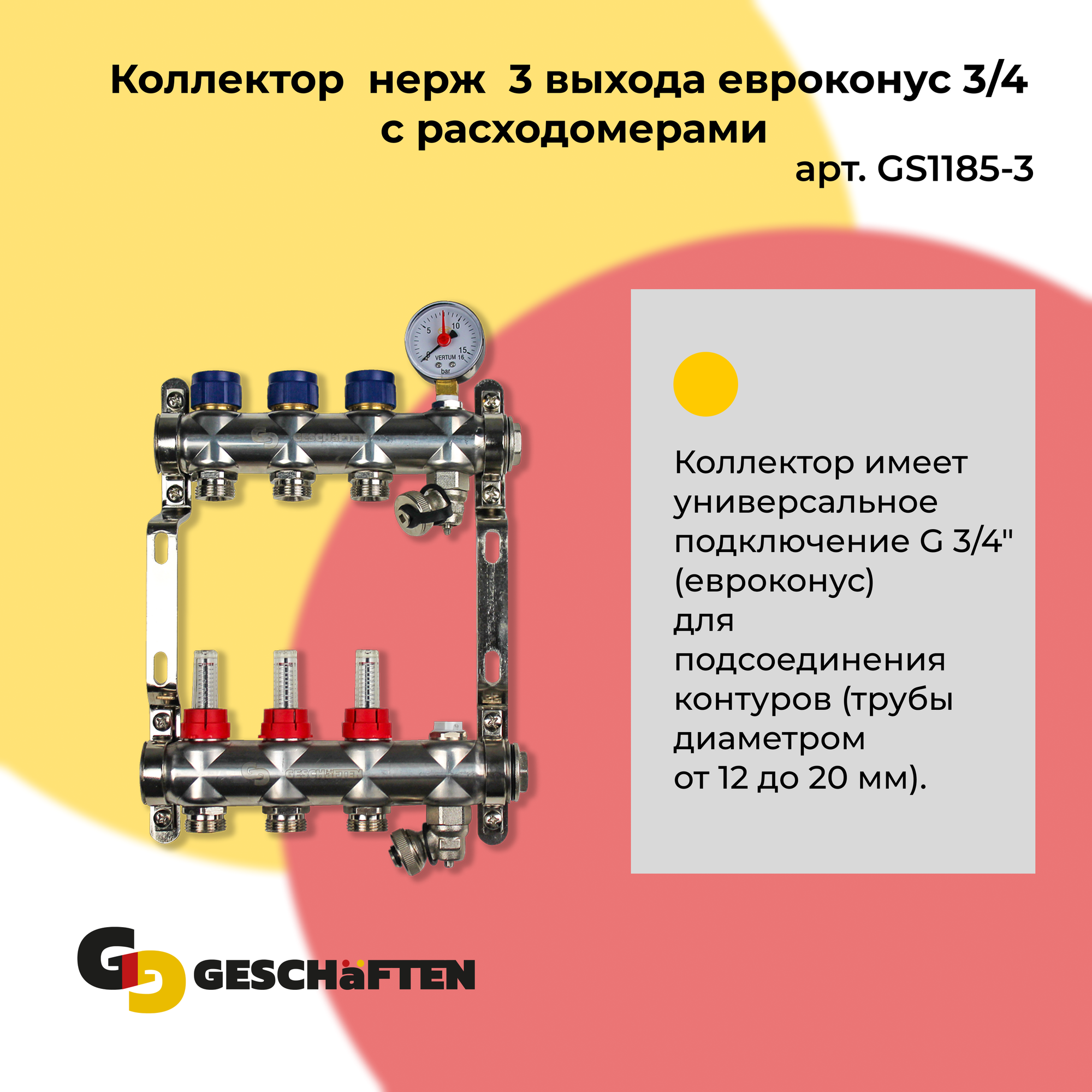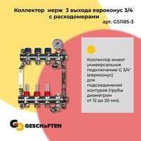 Коллектор с расходомерами для теплого пола из нержавеющей стали на 3 выхода евроконус 3/4 Geschaften: сравнение цен, характеристики, фото, актуальное наличие и цены.