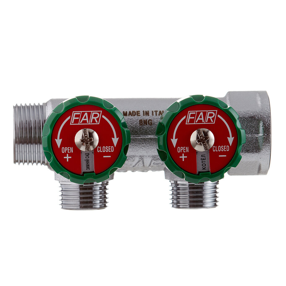 Регулирующий коллектор 3/4″х1/2″ с 2 отводами FAR FK 3821 3412TP плоское уплотнение: сравнение цен, характеристики, фото, актуальное наличие и цены.