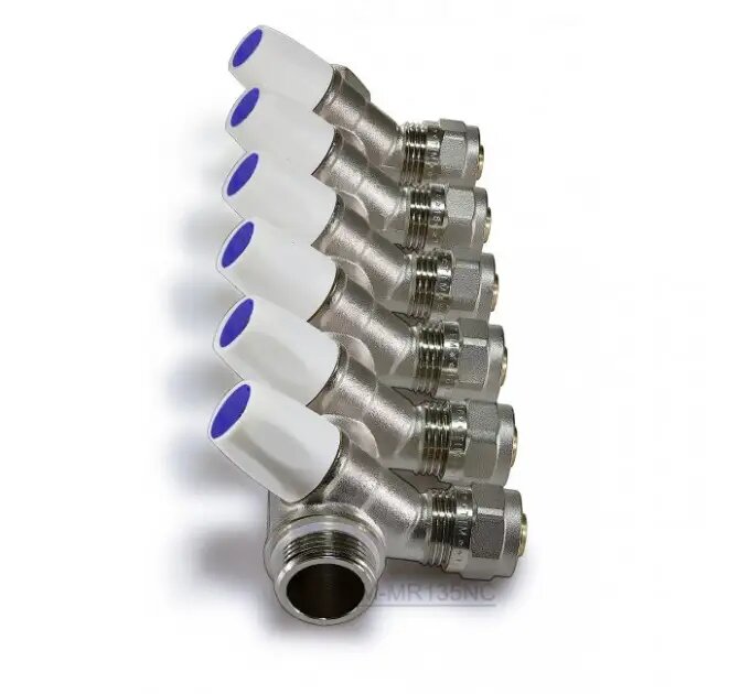 Коллектор со встроенными регулировочными вентилями распределяет рабочую жидкость по потребителям, а также имеет возможность отключения каждого из них и позволяет регулировать расход воды для каждого потребителя в отдельности.