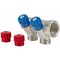 (VTc.560. NE) Латунный никелированный коллектор на 2, 3 и 4 выхода диаметром 3/4 с наружной резьбой, стандарт присоединения – евроконус. На каждом выходе предусмотрен вентиль для регулирования расхода рабочей среды. Диаметр коллектора – 1, резьба – внутренняя/наружная. Ремонтопригодный. Рабочая температура теплоносителя – до 110 °С, давление – до 10 бар. Применяется для распределения потоков жидкостей в контурах теплого пола, радиаторного отопления, холодного и горячего водоснабжения. Комплектуется набором ручек вентилей красного и синего цвета. Технические характеристикиЗначениеРабочее давление, бар10Температура рабочей среды, °СДо 110Условная пропускная способность, Kvs, м3/ч2,7 (1”)Расстояние между осями выходов, мм40Средний полный срок службы, лет15