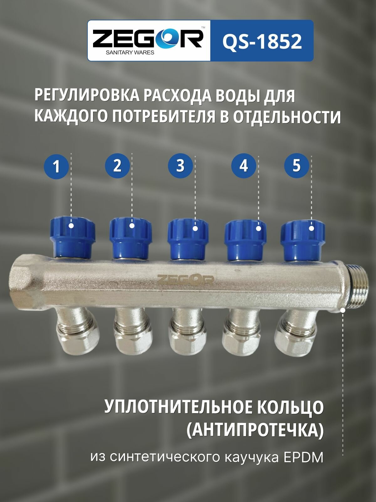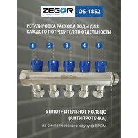 Купить Коллектор с вентилями 5 выходов ВР/НР 1″x1/2″ ZEGOR (Евроконусы 16х2,0 в комплекте) с доставкой по всей России.