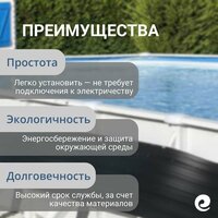Показатели для обогрева бассейна (Результаты основаны на 10 часах прямого солнечного света в день и могут отличаться в зависимости от погодных условий): 1 куб. м воды > 1 день > макс. 11.1°C 14 куб. м воды > 1 день > макс. 0.8°C 14 куб. м воды > 5 дней > макс. 4.0°C