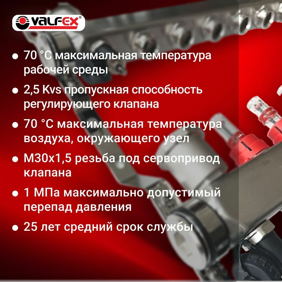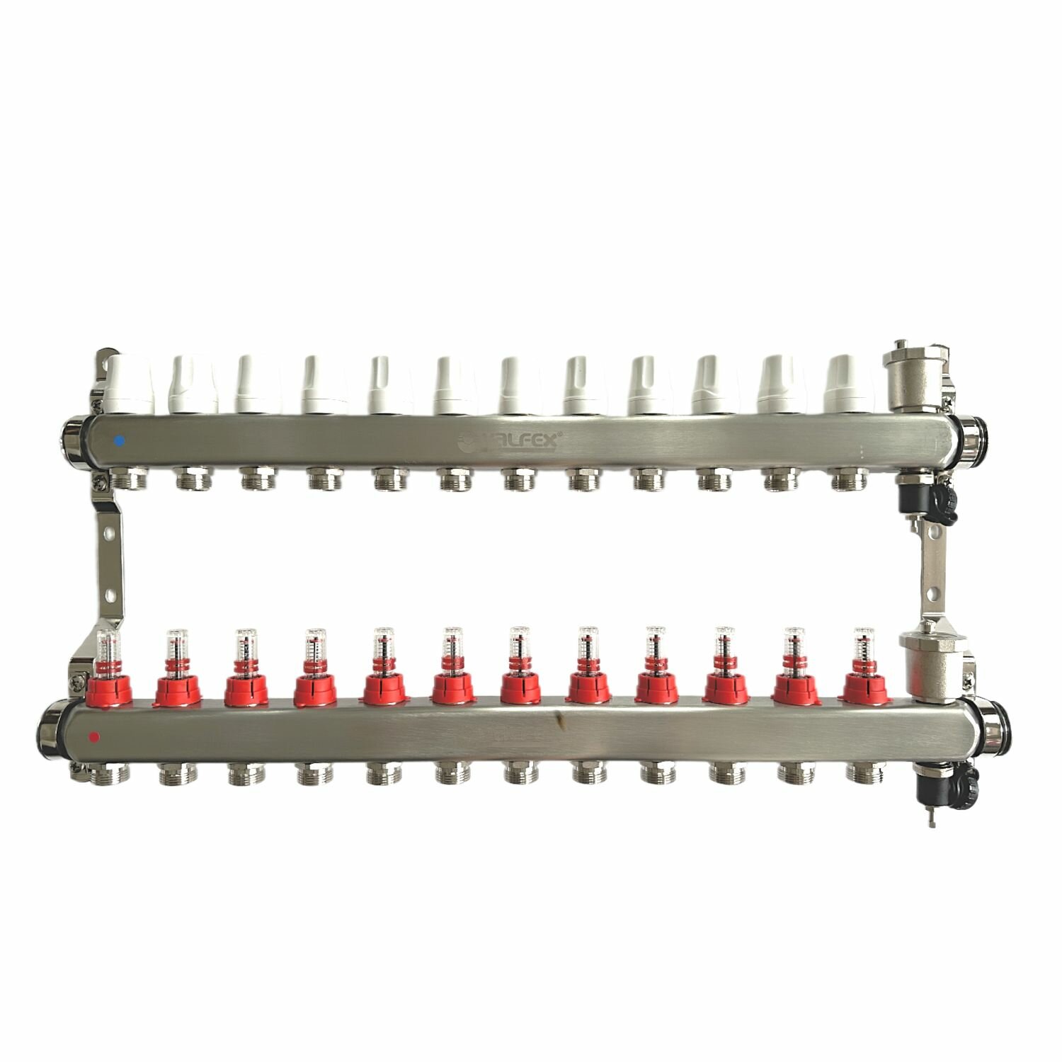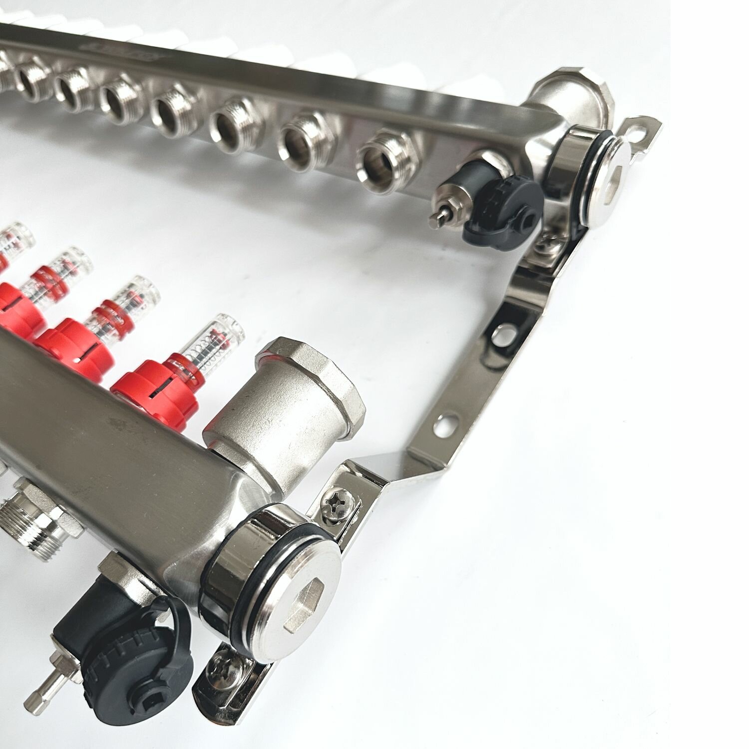 | Подробная комплектация | • Подающий коллектор из нержавеющей стали; • Обратный коллектор из нержавеющей стали; • Настроечный клапан с расходомером • Кронштейн из оцинкованной стали (2 шт); • Регулирующий клапан с колпачком под сервопривод М30х1.5. |
