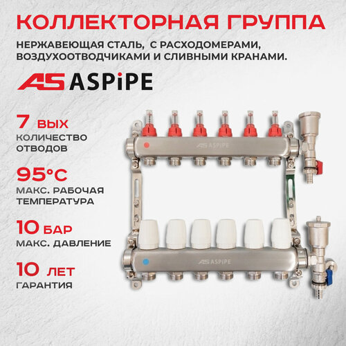 Коллекторная группа ASPiPE (AS-K001) 1″x3/4″ на 7 выходов из нержавеющей стали с расходомерами, воздухоотводчиками и сливными кранами.: сравнение цен, характеристики, фото, актуальное наличие и цены.