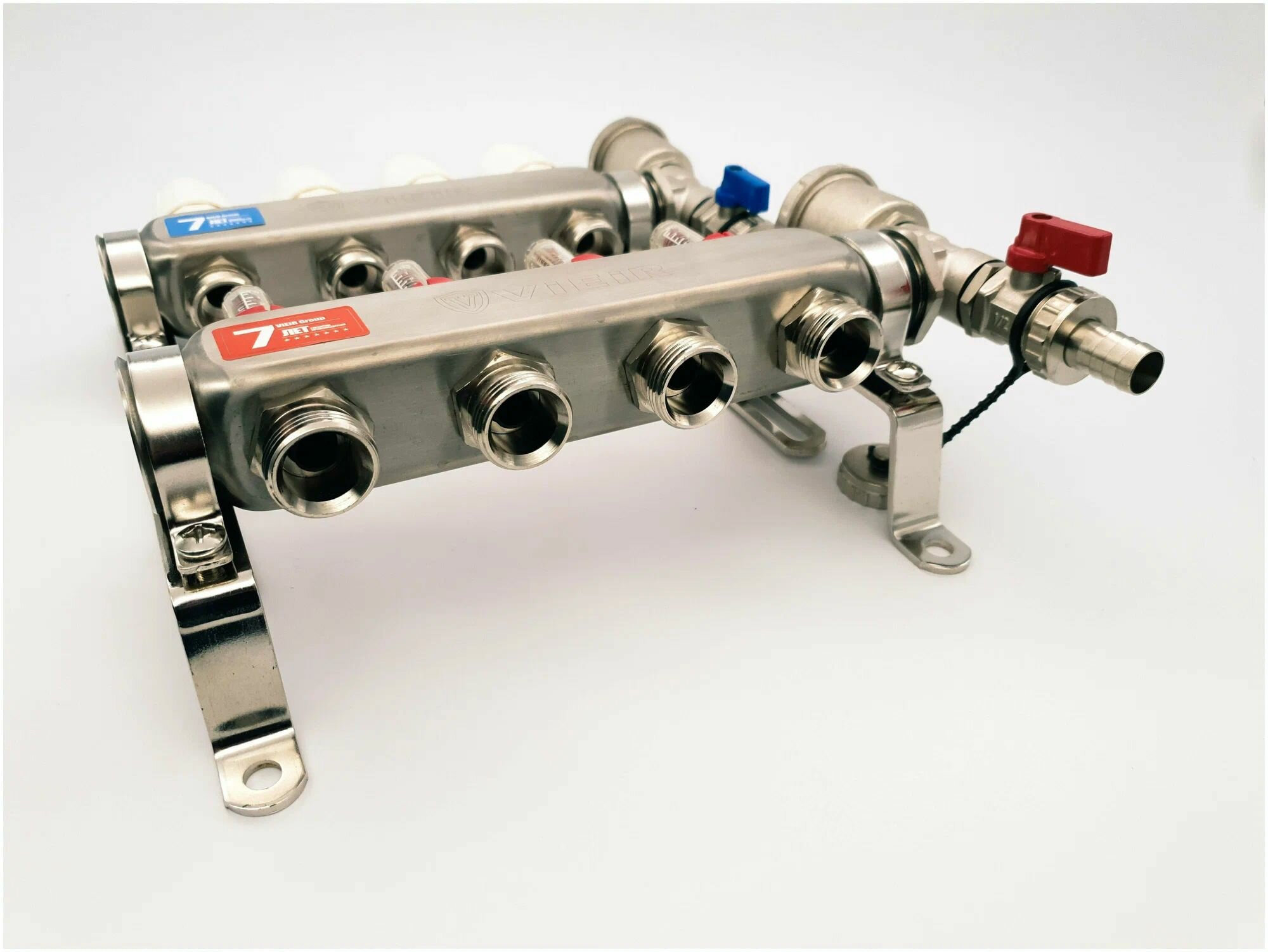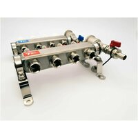 Коллекторная блок-группа из нержавеющей стали на 4 вывода без расходомеров VIEIR состоит: – Коллектор распределительный - 1 шт; – Клапан регулировочный, плавно перекрывающий поток - 4 шт; – Клапан регулировочный под шестигранник – 4 шт; – Автоматический воздухоотводчик – 2 шт; – Дренажный шаровой кран с штуцером для подключения шланга – 2 шт