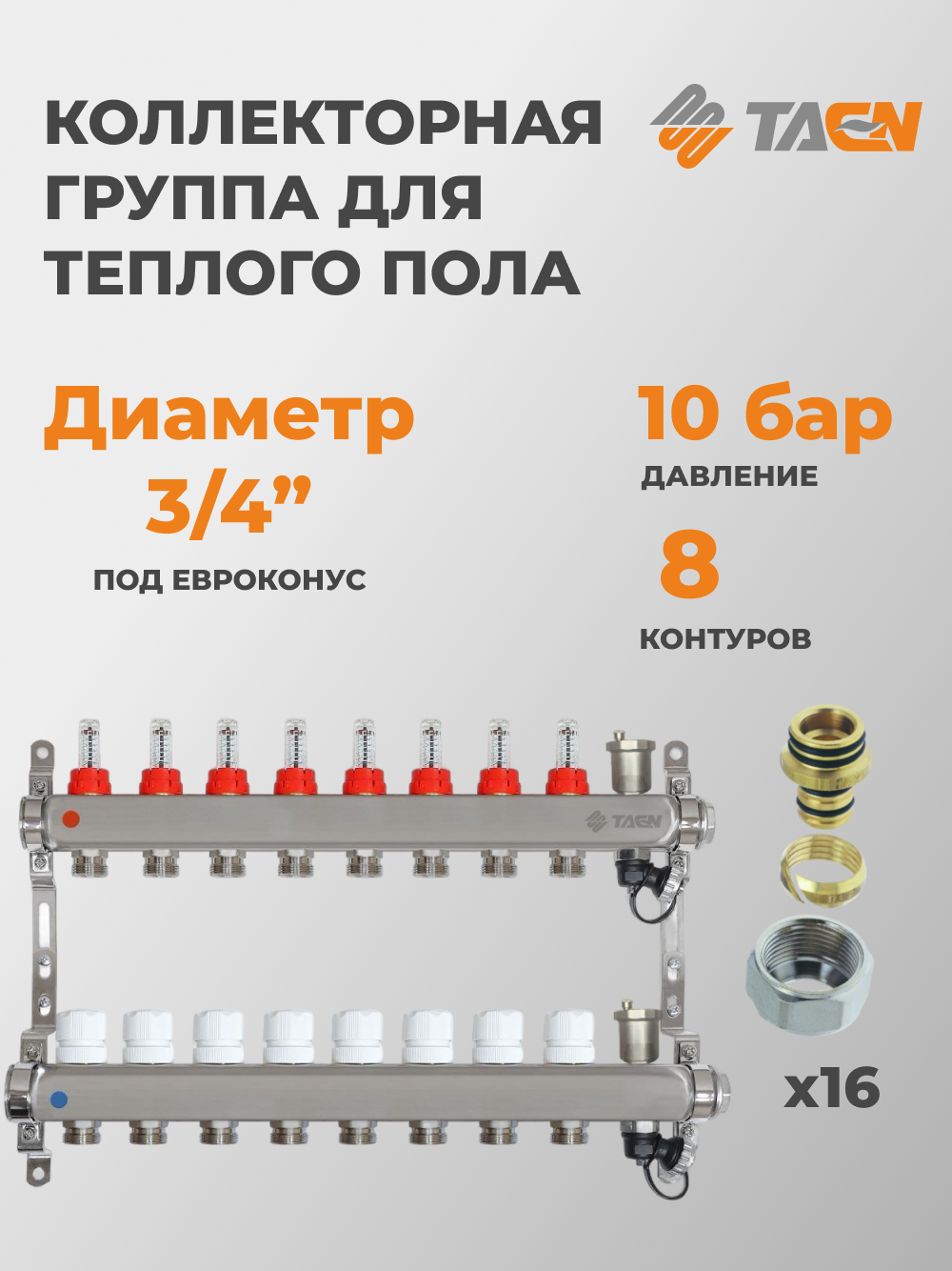 Купить Коллекторная группа для теплого пола TAEN 1×3/4×8 с расходомерами, автоматическим воздухоотводчиком + евроконус 16 шт с доставкой по всей России.