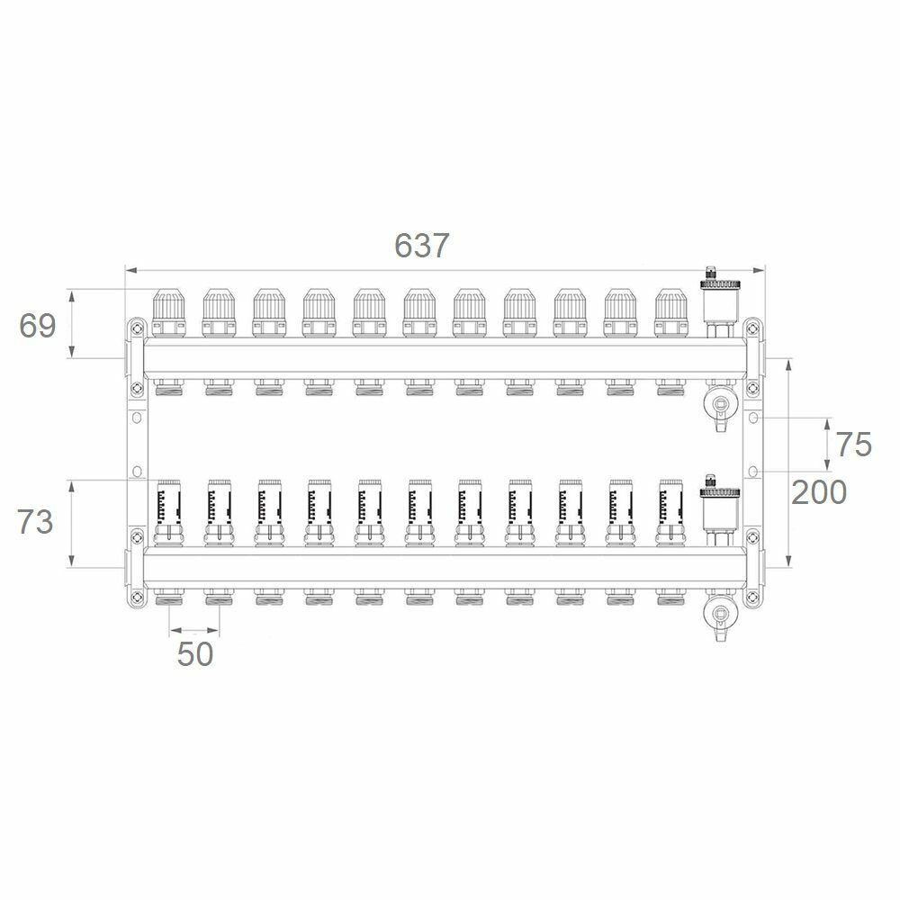 | Подробная комплектация | Подающий коллектор 1 шт., Возвратный коллектор 1 шт., Расходомер 7 шт., Термостатический клапан 7 шт., Ниппель под "евроконус" (в составе коллекторов) 14 шт., Автоматический воздухоотводчик 2 шт., Дренажный кран 2 шт., Кронштейн с креплением 2 шт. |