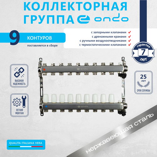 Купить Коллекторная группа ONDO нерж сталь 9 вых. в сборе с термостатическими и запорными клапанами с доставкой по всей России.