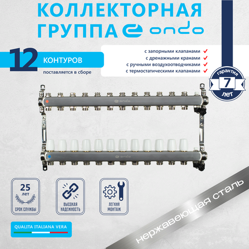 Коллекторная группа ONDO нержавеющая сталь 12 выходов в сборе с термостатическими + запорными клапанами: сравнение цен, характеристики, фото, актуальное наличие и цены.