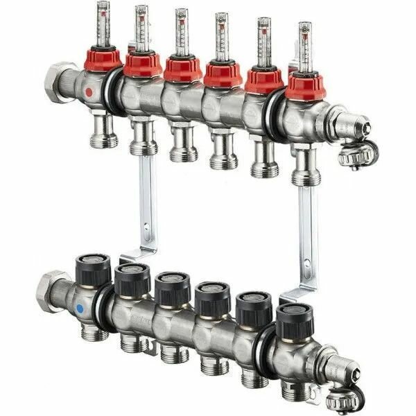 Коллекторная группа Oventrop 1″ на 6 выхода с расходомером. Изготовлена из высококачественной легированной нержавеющей стали с накидной гайкой 1″ с плоским уплотнением. Полностью смонтированы и уже готовы к установке. Оснащены воздухоспускными и концевыми пробками. Отводы с наружной резьбой G 3/4 под резьбовые соединения со стяжным кольцом Oventrop. В комплект входят монтажные хомуты. Полностью адаптированы под российские условия эксплуатации при максимальной температуре теплоносителя до 110°С и максимальным давлении в 10 бар.