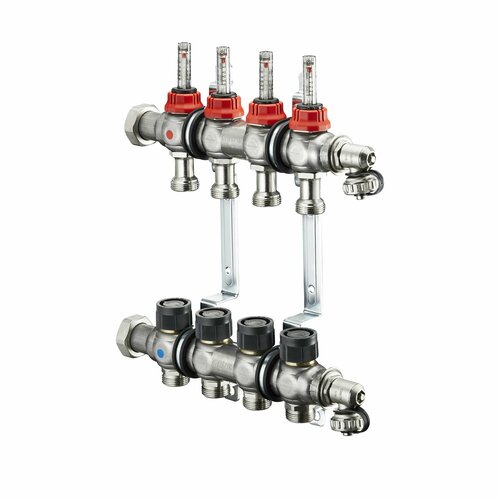 | Подробная комплектация | 4 отопительных контура со встроенными расходомерами материал: нержавеющая сталь Коллектор состоит из подающей и обратной части коллектора, кронштейна для крепления со звукопоглощающими хомутами, бокового поворотного узла с воздухоотделителем, штуцера подачи /слива и заглушкой 3/4". Подающие части коллектора оснащены регулируемыми расходомерами со шкалой от 0 до 5 л/мин для балансировки расхода в каждом контуре. Обратные части коллектора могут быть оборудованы сервоприводами (сервомоторами) при автоматическом регулировании. Максимальная рабочая температура: 60°С (максимальная до 90 °С)Рабочее давление: 6 бар Размеры подключения: подающие 1" с накидными гайками,выходы 3/4" НР (Евроконус) |