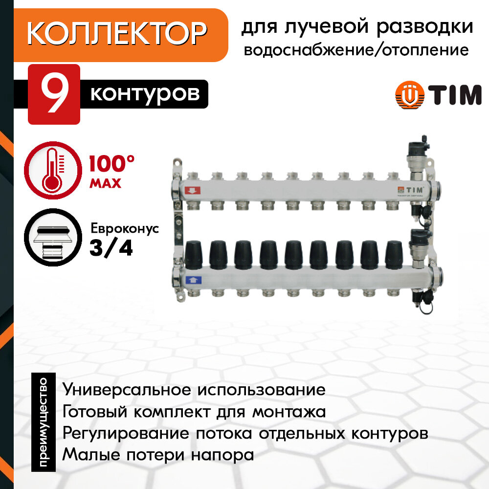 Коллектор для отопления TIM KBS5009 на 9 контуров без расходомеров и кранов: сравнение цен, характеристики, фото, актуальное наличие и цены.