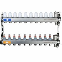 Коллекторный блок из нержавеющей стали служит для распределения потоков по контурам теплого пола, радиаторного отопления, прочих климатических систем, где в качестве теплоносителя используется вода либо незамерзающие растворы гликоля с максимальной рабочей температурой 100 °С, рабочим давлением до 10 бар. Выходы обратного коллектора блока VTс.579 оборудованы регулирующими клапанами с возможностью установки электротермических сервоприводов, подающего – настроечными клапанами с расходомерами (ротаметрами). Коллекторы оснащены автоматическими воздухоотводчиками и дренажными кранами. В комплект входит пара сдвоенных кронштейнов с двумя комплектами хомутов. Материал коллекторов – сталь AISI 304, арматуры и фитингов – латунь CW617N, уплотнительных колец и золотниковых прокладок – EPDM 70Sh. Условный диаметр коллекторов – 1". Количество выходов – от 3 до 12. Резьба выходов – наружная, 3/4". Присоединение циркуляционных петель осуществляется с помощью фитингов стандарта «евроконус».