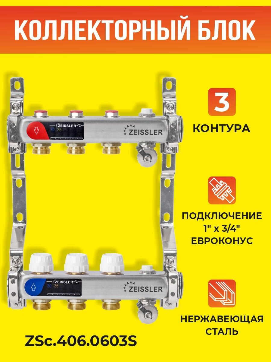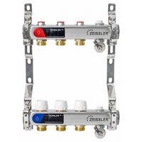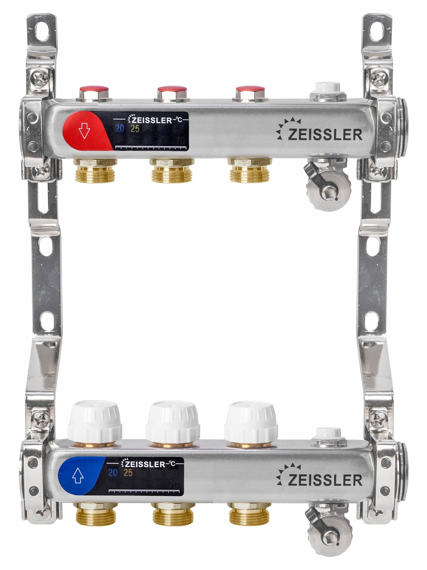 Коллекторный блок ZEISSLER на 3 выхода из нержавеющей стали с настроечными и термостатическими клапанами, дренажными клапанами и воздухоотводчиками 1*3/4 ЕК: сравнение цен, характеристики, фото, актуальное наличие и цены.