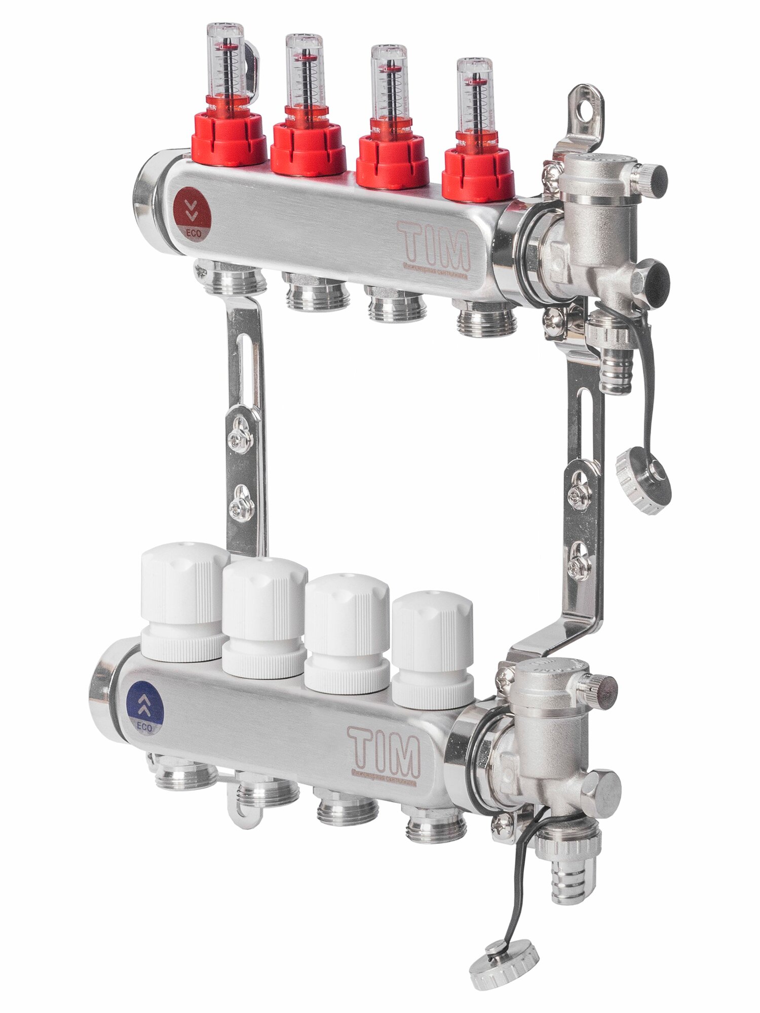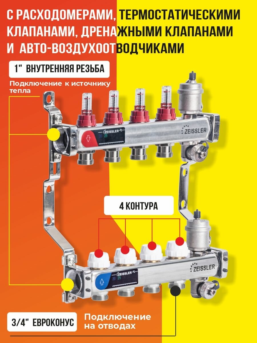 Коллекторный блок ZEISSLER на 4 выхода из нержавеющей стали с расходомерами, термостатическими клапанами, дренажными клапанами и авто-воздухоотводчиками 1*3/4 ЕК: сравнение цен, характеристики, фото, актуальное наличие и цены.
