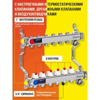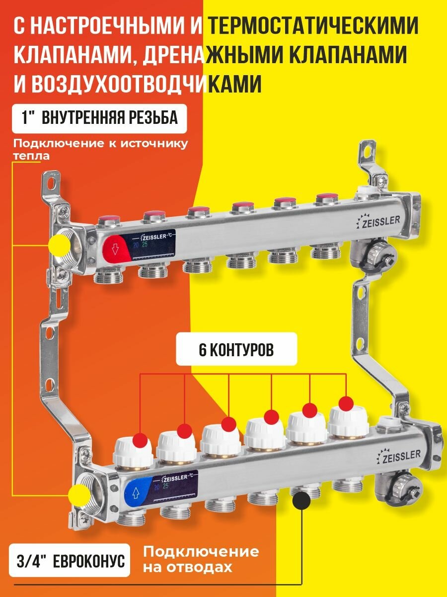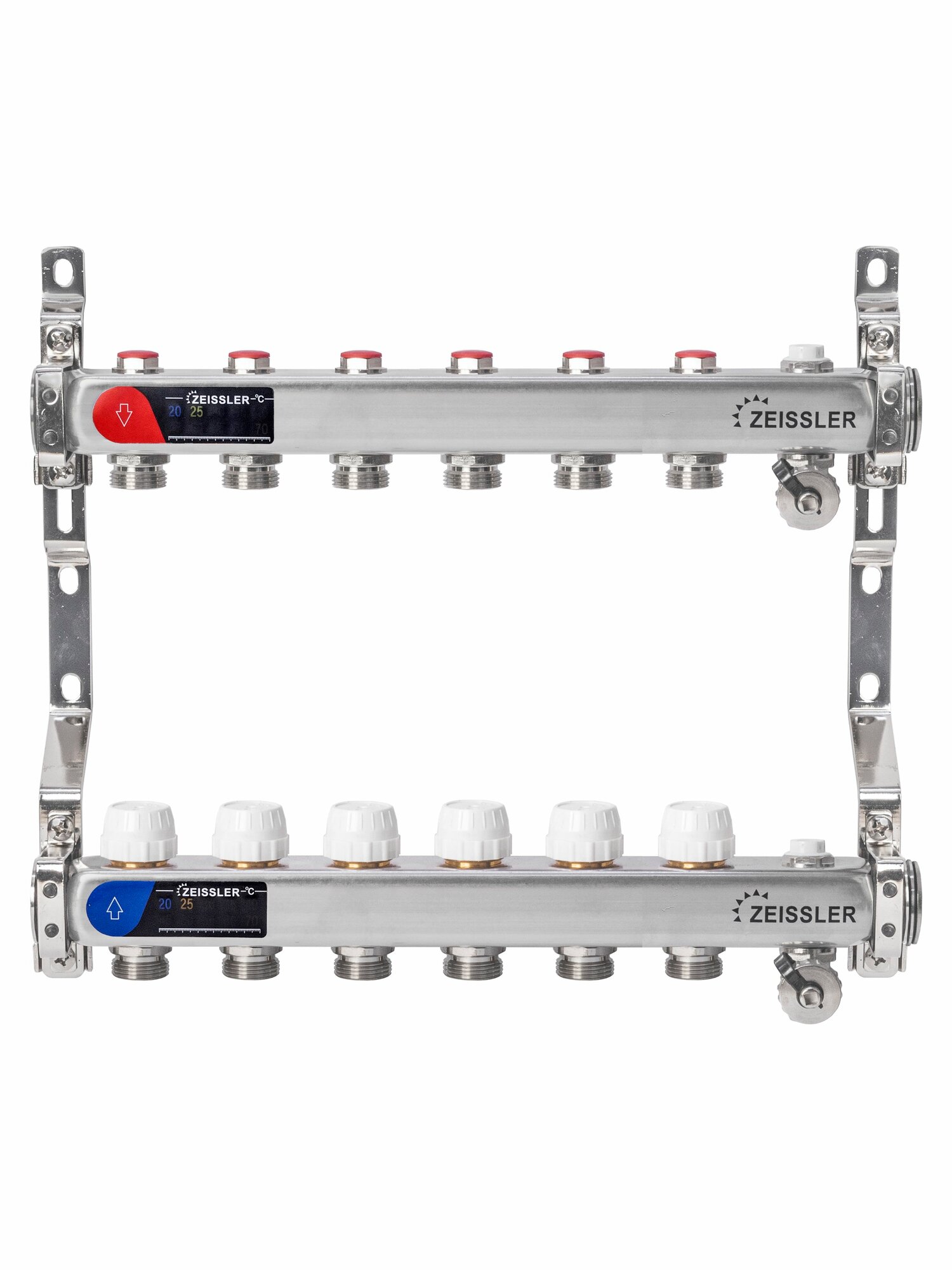 Коллекторный блок ZEISSLER на 6 выходов из нержавеющей стали с настроечными и термостатическими клапанами, дренажными клапанами и воздухоотводчиками 1*3/4 ЕК: сравнение цен, характеристики, фото, актуальное наличие и цены.