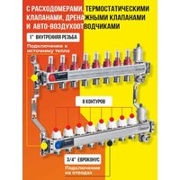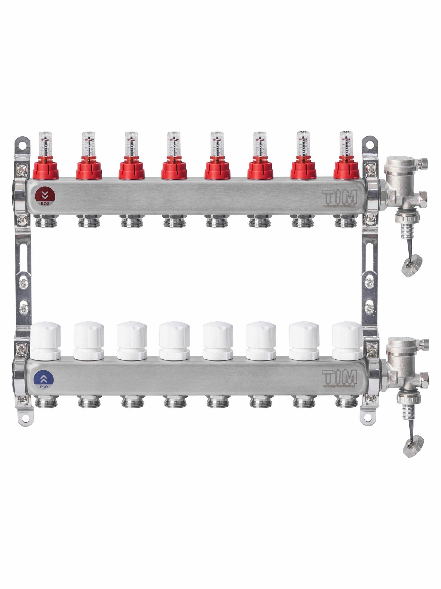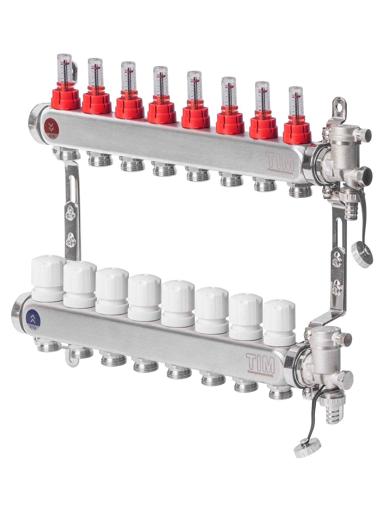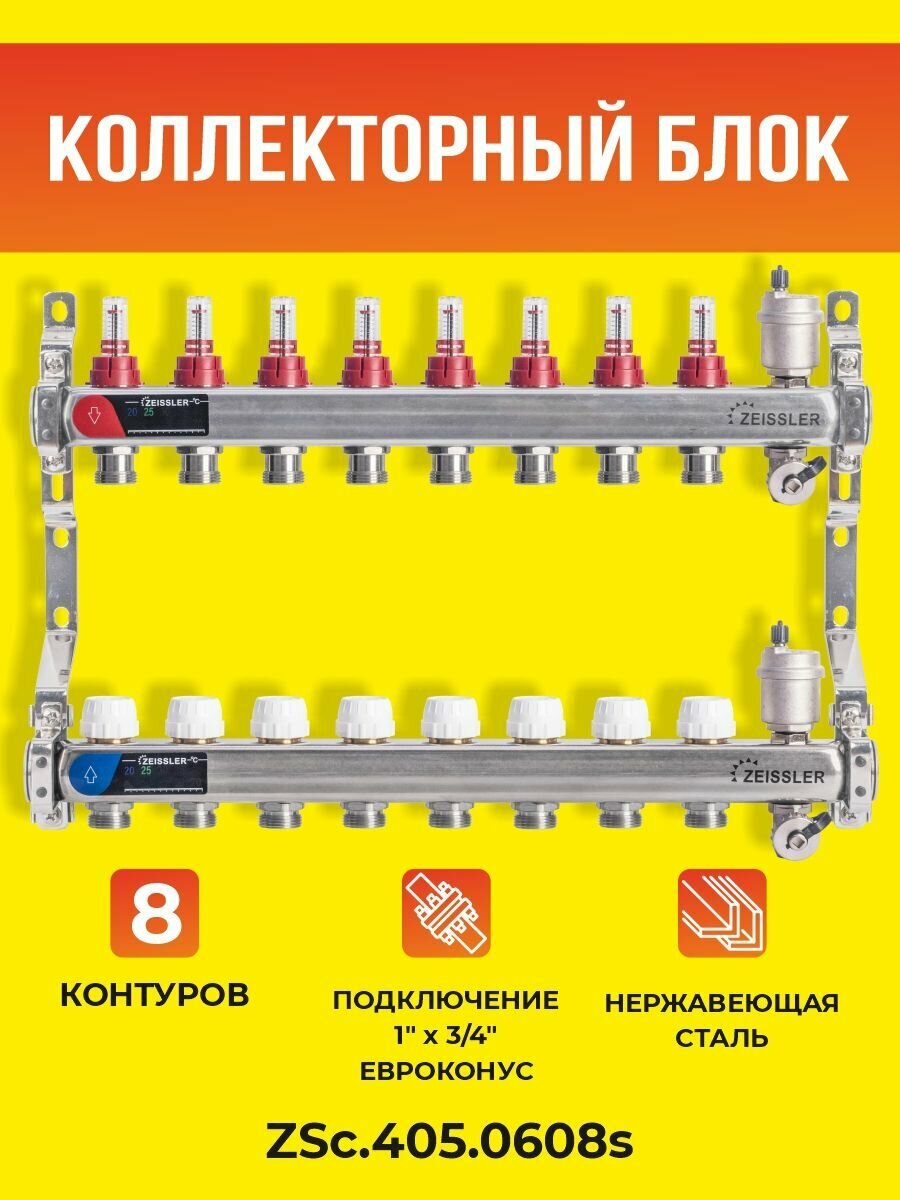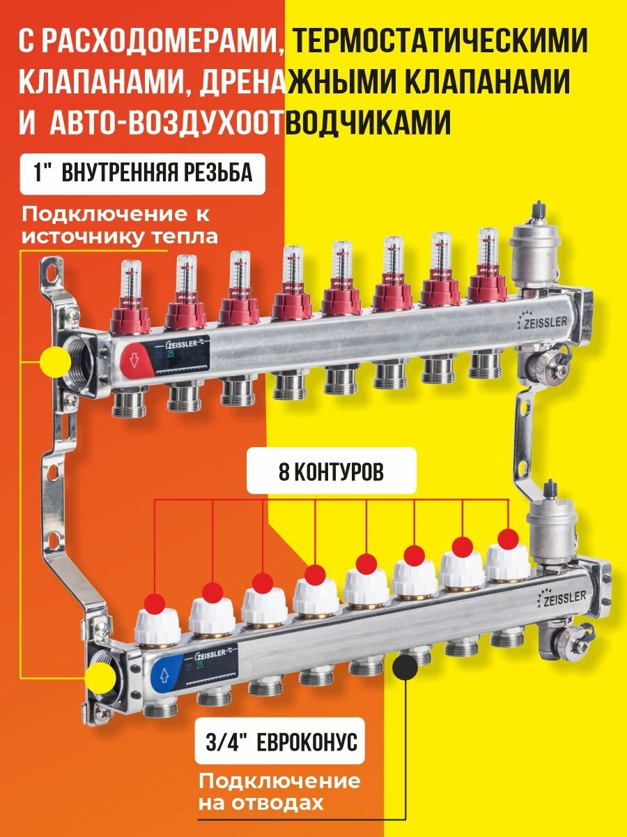 Коллекторный блок ZEISSLER на 8 выходов из нержавеющей стали с расходомерами, термостатическими клапанами, дренажными клапанами и авто-воздухоотводчиками 1*3/4 ЕК: сравнение цен, характеристики, фото, актуальное наличие и цены.