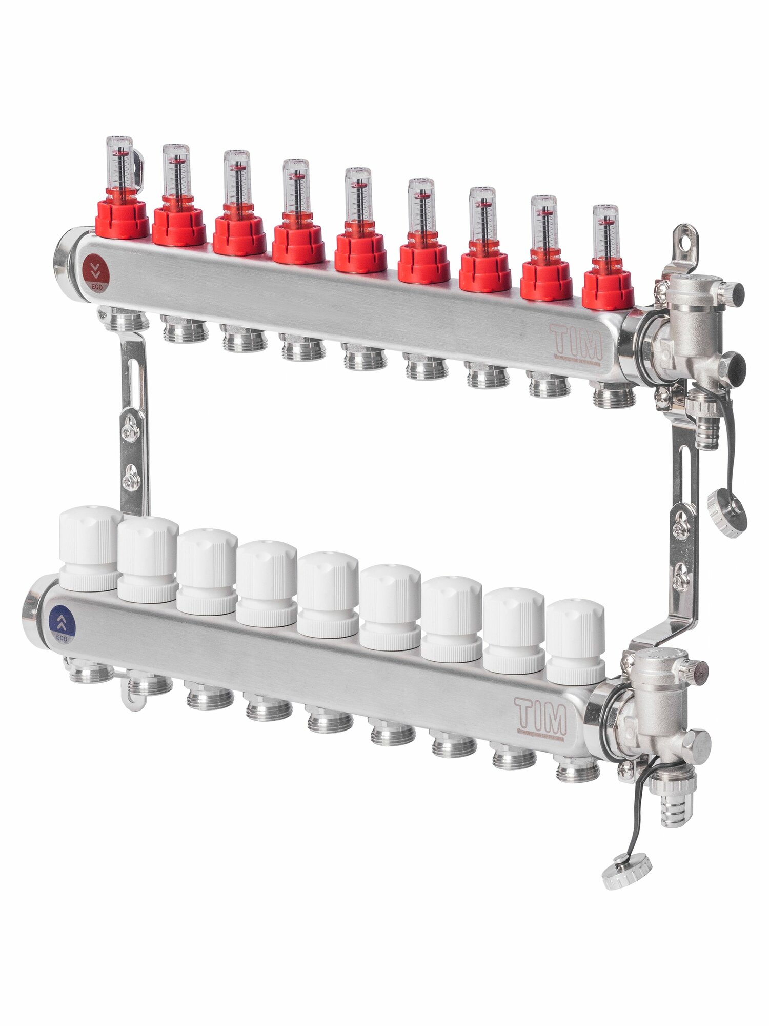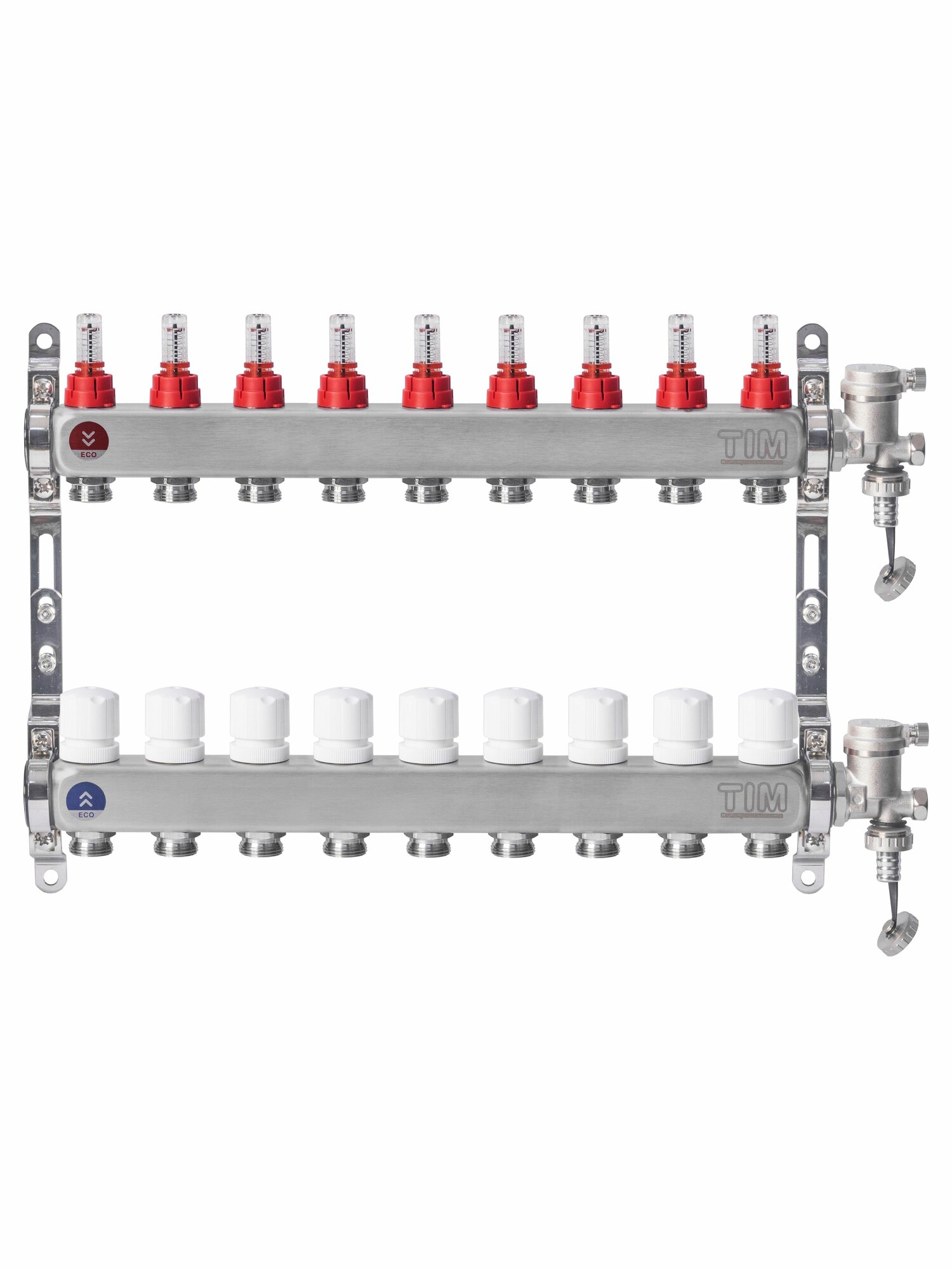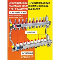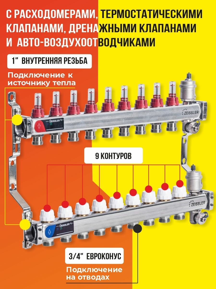 Коллекторный блок ZEISSLER на 9 выходов из нержавеющей стали с расходомерами, термостатическими клапанами, дренажными клапанами и авто-воздухоотводчиками 1*3/4 ЕК: сравнение цен, характеристики, фото, актуальное наличие и цены.