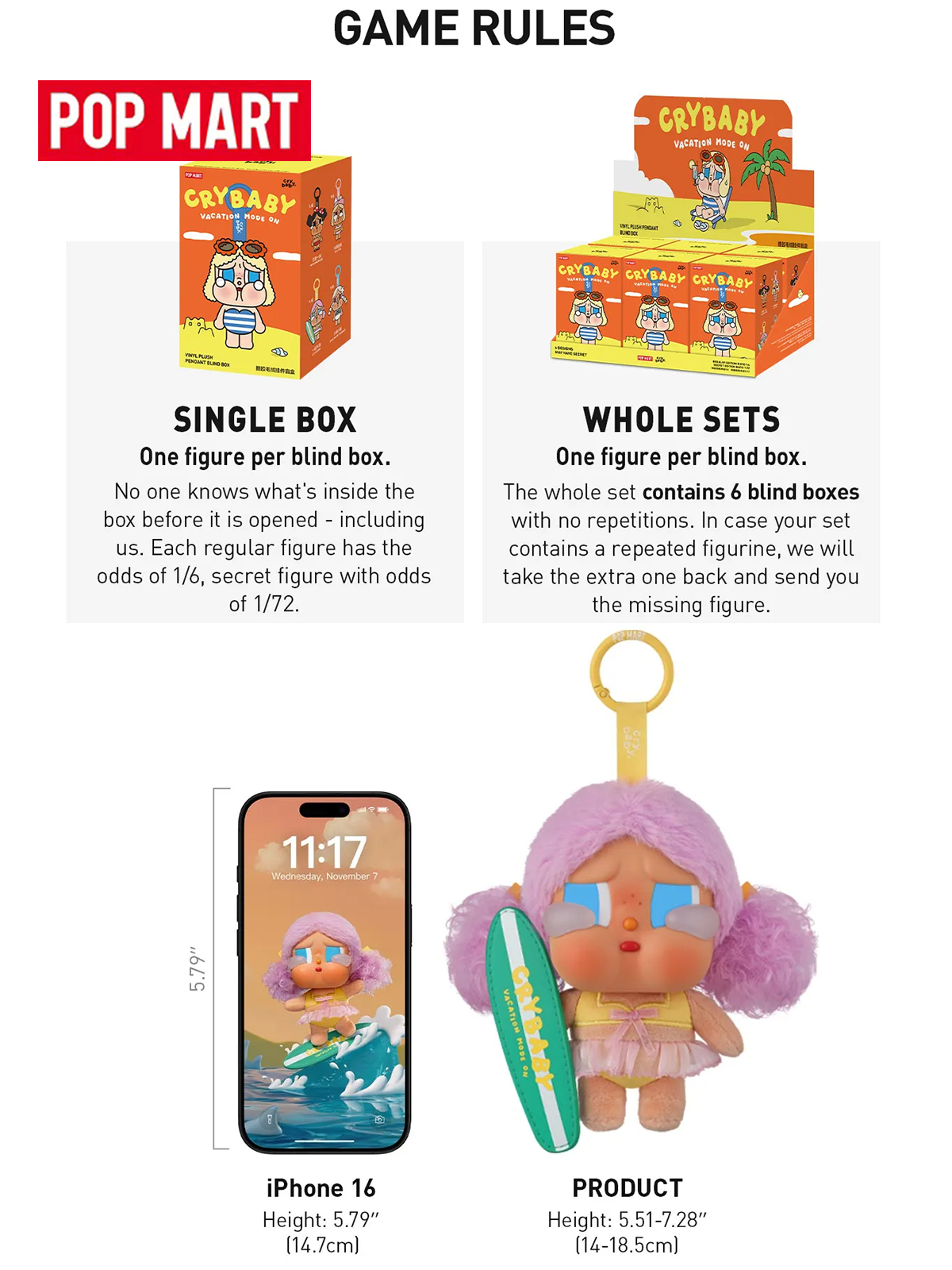 Благодарим вас за интерес к серии CRYBABY Vacation Mode On Series-Vinyl Plush Pendant Blind Box! Эта серия включает 6 стандартных фигурок и 1 редкую скрытую фигурку.
