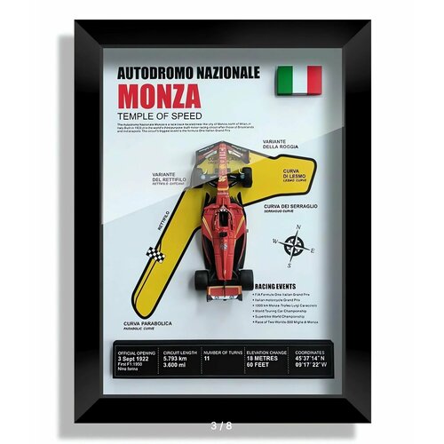 Данный набор, без преувеличения, является лучшим подарком для фаната Формулы-1, а особенно почитателя Шарля Леклера. Это рамка в честь победы Шарля на трассе в Монце. Содержит модель его болида сезона 2024 года - Ferrari SF-24 и саму схему итальянской трассы. Рамка стеклянная, обрамление из дерева темного цвета. Набор увесистый - чуть менее килограмма. Очень солидная вещь, как для украшения стены, так и для полки. Возможен любой крепеж на ваше усмотрение. Модель масштаба 1:43, длина машинки - 13 см. Упакована достаточно надежно. Помимо индивидуальной коробки, дополнительно обрамлена в пенопласт. Так что должно все дойти к вам целым и невредимым!