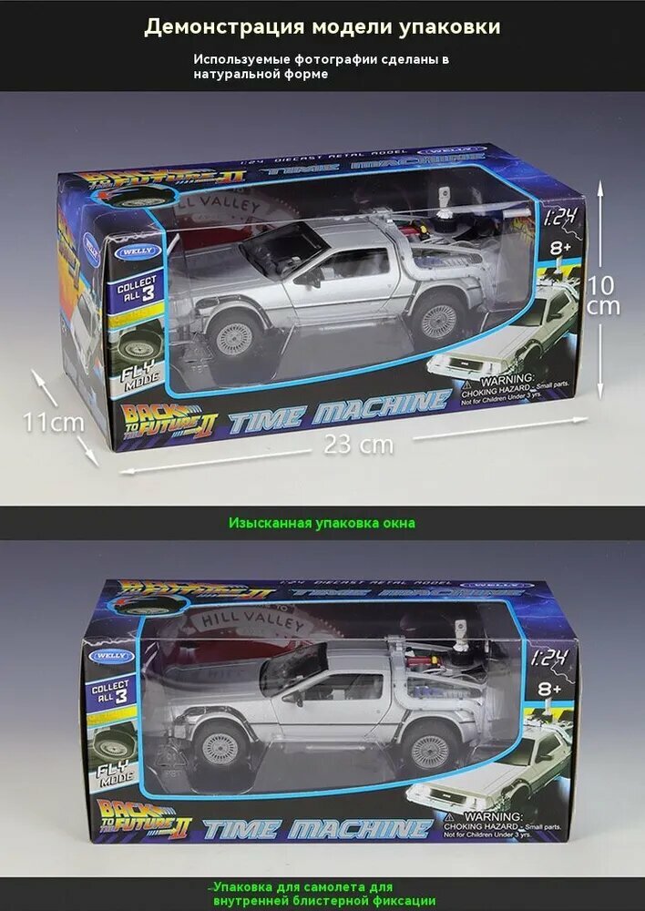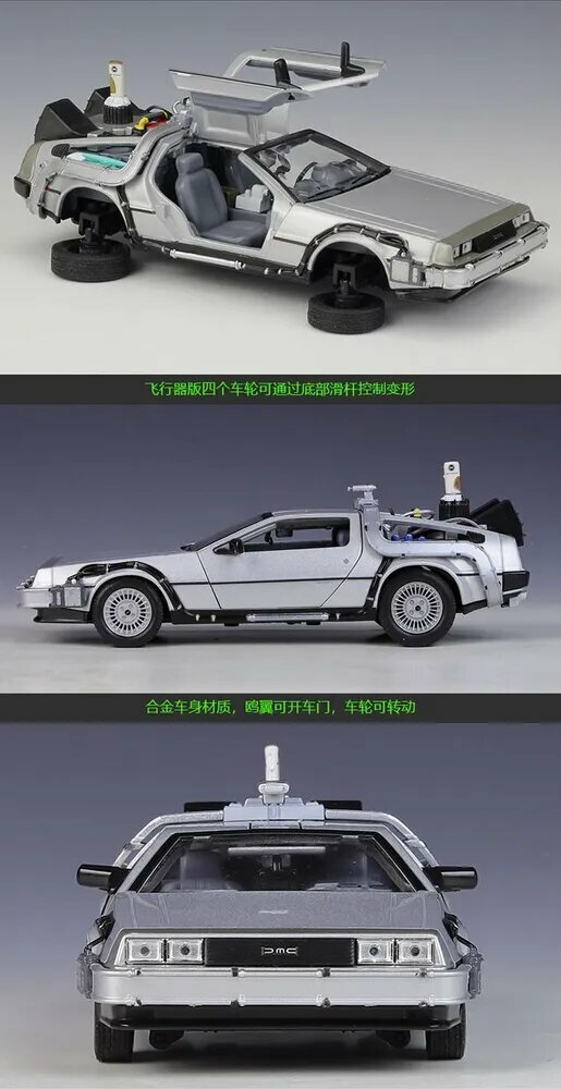 Металлическая модель автомобиля DeLorian в масштабе 1:24 из культовой кинотрилогии "Назад в будущее". Модель имеет высокую детализацию и открывающиеся элементы, произведена по лицензии компанией "Welly". Эта версия "Летающей машины" , снизу имеется слайдер-переключатель, который позволяет переключать вид машины из "летающей версии" в "дорожную" и ообратно.