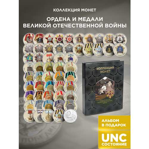 В наборе 54 монеты с изображением награждений участников ВОВ, которые хранят в себе память наших дедов и прадедов. Среди монет вы найдете орден Красного Знамени, орден Ленина, орден Красной Звезды, медаль "За оборону Сталинграда, медаль "За отвагу" и другие.