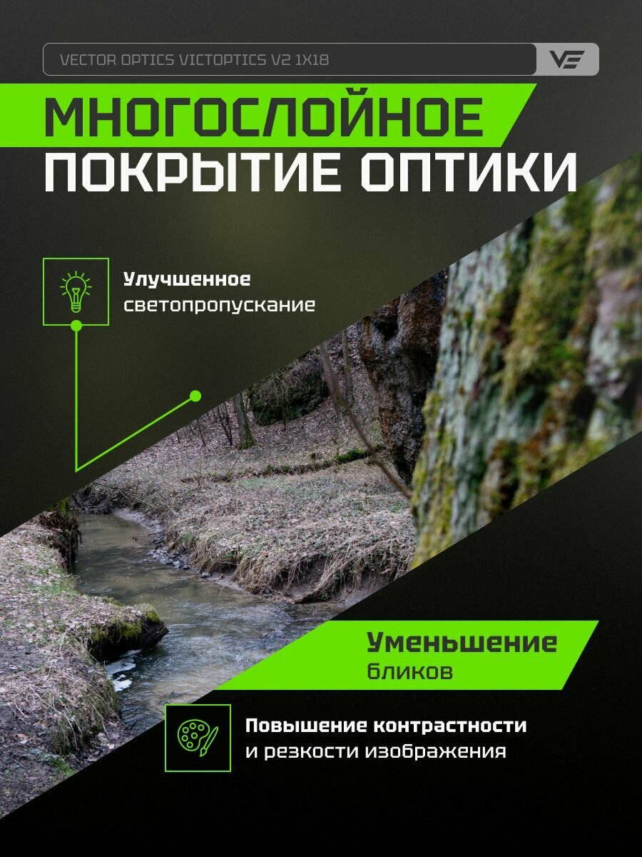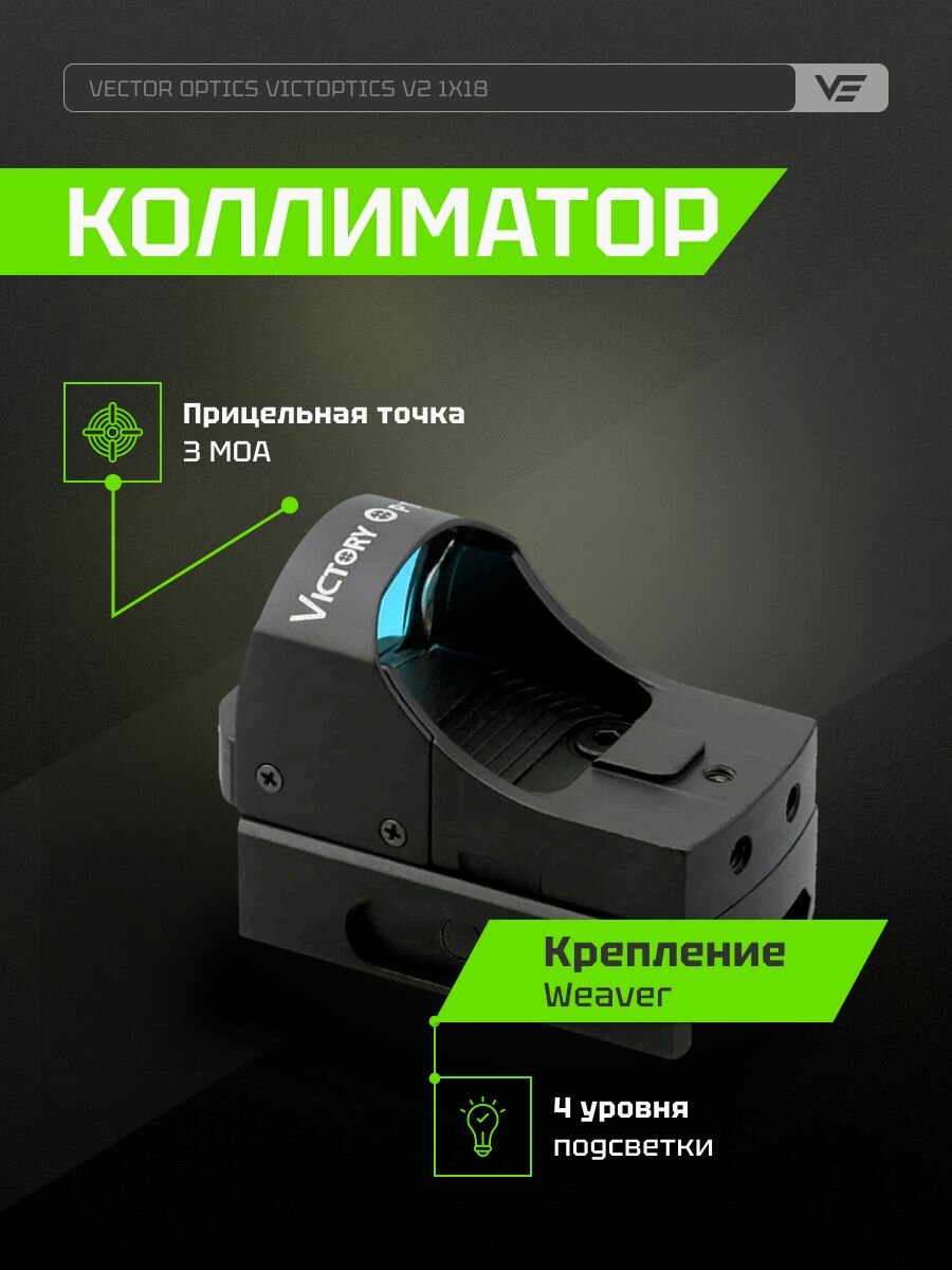 Коллиматор Vector Optics VictOptics V2 1x18 (RDSL01) — открытый прицел для быстрой стрельбы на ближних дистанциях, охоты с подхода и активных спортивных дисциплин. Особенности: * Широкое поле зрения. Размер окна — 18 на 22,5 мм, обеспечивает широкое поле зрения 6,5° на 100 ярдов. * Многослойное просветление окна. Гарантирует отличную видимость цели даже при слабом освещении. * Статичная кратность 1x и неограниченное удаление выходного зрачка. Позволяют стрелять с открытыми глазами из любого положения. * Прицельная точка 3 MOA. Оптимальна для точного прицеливания и стрельбы на малых и средних дистанциях. * Регулируемая подсветка. С помощью регулировок на корпусе стрелок подстраивает яркость отображения точки на линзе в зависимости от условий освещения. * Прочность и компактность. Корпус прицела изготовлен из прочного алюминиевого сплава, что обеспечивает его устойчивость к отдаче калибров до 30-06. * Энергоэффективность. Оснащён кнопкой включения/выключения прицельной точки. Стрелок может активировать прицел только при необходимости, экономя заряд батареи CR2032. * Защита от влаги. Прицел надёжно защищён от влаги, что позволяет использовать его в сложных полевых условиях. Установка прицела производится на планку Пикатинни с помощью вращающегося…