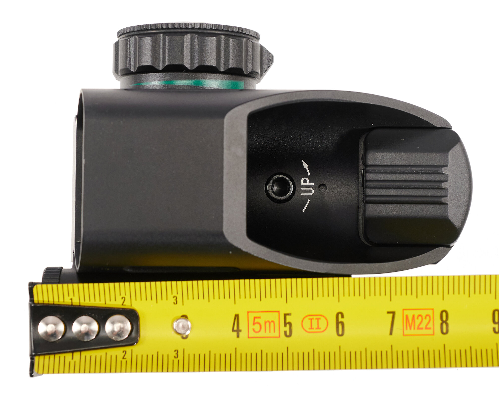 Метку можно изменять между красным и зеленым цветом - для выбора насыщенности и оттенка у правой стенки расположен барабан. На маховике помечен каждый из режимов, а также при установке на нейтральный режим прицел выключается. В качестве источника энергии в коллиматоре применяется одна батарея CR2032, которая идет в комплекте и размещается в боковом регуляторе.