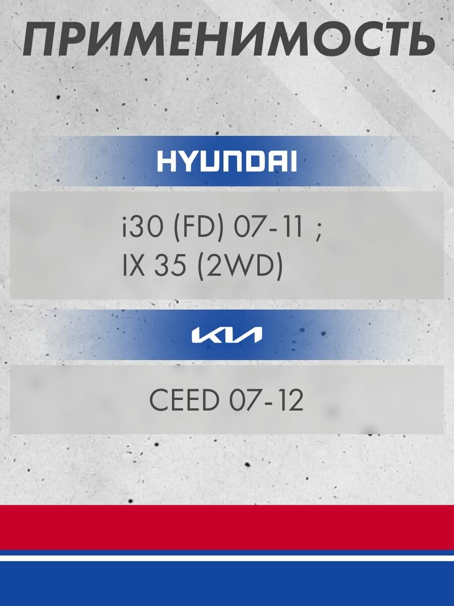 | Модель автомобиля | BYD F3, Changan CS35, Changan CS75, Chery Amulet, Chery Bonus 3, Chery CrossEastar, Chery Fora, Chery IndiS, Chery M11, Chery Tiggo, Chery Tiggo 4, Chery Tiggo 7, Chery Tiggo 7 Pro, Chery Tiggo 8 Pro, Chevrolet Aveo, Chevrolet Cruze, Chevrolet Orlando, Chevrolet Spark, Daihatsu Charade, Daihatsu Sirion, FAW V5, Ford Focus, Ford Focus C-Max, Geely Atlas, Geely Coolray, Geely Emgrand EC7, Geely Emgrand X7, Geely GC6, Geely MK, Geely MK Cross, Geely Monjaro, Geely Otaka, Geely SC7, Geely Tugella, Geely Vision, Great Wall Hover, Great Wall Hover H3, Great Wall Hover H5, Great Wall Hover H6, Great Wall Pegasus, Great Wall Safe, Great Wall Wingle, Haval Dargo, Haval F7, Haval F7X, Haval H8, Haval H9, Haval Jolion, Hyundai Accent, Hyundai Avante, Hyundai Creta, Hyundai Elantra, Hyundai Getz, Hyundai Grand Starex, Hyundai Lantra, Hyundai Matrix, Hyundai Santa Fe, Hyundai Solaris, Hyundai Sonata, Hyundai Starex, Hyundai Terracan, Hyundai Tucson, Hyundai Veloster, Hyundai Verna, Hyundai i20, Hyundai i30, Hyundai i40, Hyundai i40 CW, Hyundai ix35, JAC J7, Kia Carens, Kia Ceed, Kia Cerato, Kia K5, Kia Magentis, Kia Mohave, Kia Optima, Kia Picanto, Kia Rio, Kia Shuma, Kia Sorento, Kia Sorento Prime, Kia Soul, Kia Spectra, Kia Sportage, Lifan Breez, Lifan Cebrium, Lifan Celliya, Lifan Myway, Lifan Smily, Lifan Solano, Lifan X50, Lifan X60, Lifan X70, Mazda 3, Opel Astra J, Opel Cascada, Opel Mokka, Opel Zafira, Peugeot 107, Renault Logan, Renault Megane, Renault Sandero, Renault Symbol, Skoda Fabia, Skoda Rapid, Ssang.Yong Actyon, SsangYong Actyon, SsangYong Actyon Sports, SsangYong Kyron, Tank 300, Toyota Caldina, Toyota Camry, Toyota Corolla, Toyota Corolla Fielder, Toyota Echo, Toyota Funcargo, Toyota Prius, Toyota Vitz, Toyota Yaris, Volvo XC40 |
