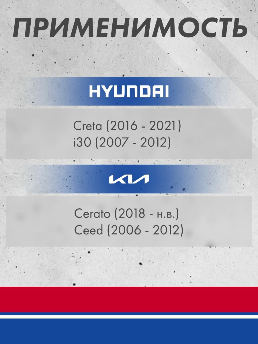 | Модель автомобиля | BYD F3, Changan CS35, Changan CS75, Chery Amulet, Chery Bonus 3, Chery CrossEastar, Chery Fora, Chery IndiS, Chery M11, Chery Tiggo, Chery Tiggo 4, Chery Tiggo 7, Chery Tiggo 7 Pro, Chery Tiggo 8 Pro, Chevrolet Aveo, Chevrolet Cruze, Chevrolet Orlando, Chevrolet Spark, Daihatsu Charade, Daihatsu Sirion, FAW V5, Ford Focus, Ford Focus C-Max, Geely Atlas, Geely Coolray, Geely Emgrand EC7, Geely Emgrand X7, Geely GC6, Geely MK, Geely MK Cross, Geely Monjaro, Geely Otaka, Geely SC7, Geely Tugella, Geely Vision, Great Wall Hover, Great Wall Hover H3, Great Wall Hover H5, Great Wall Hover H6, Great Wall Pegasus, Great Wall Safe, Great Wall Wingle, Haval Dargo, Haval F7, Haval F7X, Haval H8, Haval H9, Haval Jolion, Hyundai Accent, Hyundai Avante, Hyundai Creta, Hyundai Elantra, Hyundai Getz, Hyundai Grand Starex, Hyundai Lantra, Hyundai Matrix, Hyundai Santa Fe, Hyundai Solaris, Hyundai Sonata, Hyundai Starex, Hyundai Terracan, Hyundai Tucson, Hyundai Veloster, Hyundai Verna, Hyundai i20, Hyundai i30, Hyundai i40, Hyundai i40 CW, Hyundai ix35, JAC J7, Kia Carens, Kia Ceed, Kia Cerato, Kia K5, Kia Magentis, Kia Mohave, Kia Optima, Kia Picanto, Kia Rio, Kia Shuma, Kia Sorento, Kia Sorento Prime, Kia Soul, Kia Spectra, Kia Sportage, Lifan Breez, Lifan Cebrium, Lifan Celliya, Lifan Myway, Lifan Smily, Lifan Solano, Lifan X50, Lifan X60, Lifan X70, Mazda 3, Opel Astra J, Opel Cascada, Opel Mokka, Opel Zafira, Peugeot 107, Renault Logan, Renault Megane, Renault Sandero, Renault Symbol, Skoda Fabia, Skoda Rapid, Ssang.Yong Actyon, SsangYong Actyon, SsangYong Actyon Sports, SsangYong Kyron, Tank 300, Toyota Caldina, Toyota Camry, Toyota Corolla, Toyota Corolla Fielder, Toyota Echo, Toyota Funcargo, Toyota Prius, Toyota Vitz, Toyota Yaris, Volvo XC40 |