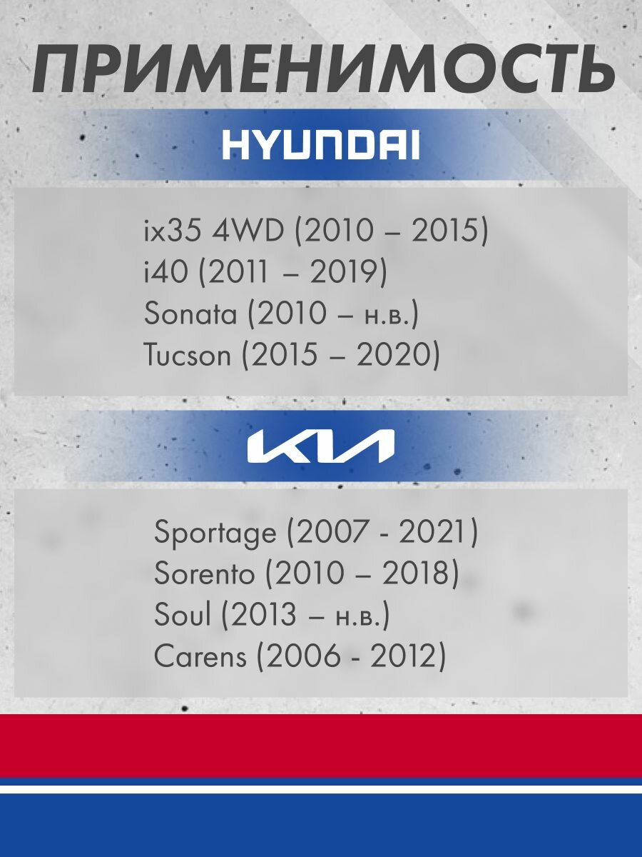 | Модель автомобиля | Chery Amulet, Chery Bonus 3, Chery CrossEastar, Chery Fora, Chery IndiS, Chery M11, Chery Tiggo, Chery Tiggo 4, Chery Tiggo 7, Chery Tiggo 7 Pro, Chevrolet Aveo, Chevrolet Cruze, Chevrolet Orlando, Chevrolet Spark, Geely Coolray, Geely Emgrand X7, Geely GC6, Geely Monjaro, Geely Tugella, Great Wall Hover, Great Wall Hover H3, Great Wall Hover H5, Great Wall Pegasus, Great Wall Safe, Great Wall Wingle, Haval Dargo, Haval F7, Haval F7X, Haval H8, Haval H9, Haval Jolion, Hyundai Accent, Hyundai Avante, Hyundai Creta, Hyundai Elantra, Hyundai Getz, Hyundai Grand Starex, Hyundai Lantra, Hyundai Matrix, Hyundai Santa Fe, Hyundai Sonata, Hyundai Starex, Hyundai Terracan, Hyundai Tucson, Hyundai Veloster, Hyundai Verna, Hyundai i20, Hyundai i30, Hyundai i40, Hyundai i40 CW, Hyundai ix35, JAC J7, Kia Carens, Kia Ceed, Kia Cerato, Kia K5, Kia Mohave, Kia Optima, Kia Picanto, Kia Rio, Kia Shuma, Kia Sorento, Kia Sorento Prime, Kia Soul, Kia Spectra, Kia Sportage, Lifan Solano, Lifan X60, Lifan X70, Opel Astra J, Opel Cascada, Opel Mokka, Opel Zafira, Skoda Fabia, Skoda Rapid, Ssang.Yong Actyon, SsangYong Actyon, SsangYong Actyon Sports, SsangYong Kyron, Volvo XC40 |