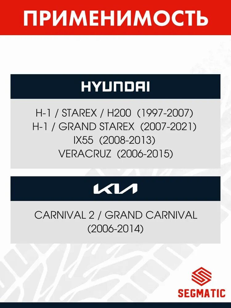 | Модель автомобиля | Audi A3, Audi Q7, BMW 3 series, BMW 5 series, BMW 7 series, BMW X3, Changan CS35, Changan Eado, Chery Tiggo 4, Chery Tiggo 7 Pro, Chery Tiggo 8 Pro Max, Chevrolet Aveo, Chevrolet Captiva, Chevrolet Cobalt, Chevrolet Cruze, Chevrolet Epica, Chevrolet Lacetti, Chevrolet Lanos, Chevrolet Orlando, Chevrolet Spark, Citroen Berlingo, Citroen Jumper, Daewoo Gentra, Daewoo Matiz, Daewoo Nexia, EXEED LX, EXEED TXL, Fiat Ducato, Ford EcoSport, Ford Focus, Ford Kuga, Ford Mondeo, Ford Tourneo Connect, Ford Transit, Geely Coolray, Haval Dargo, Haval F7, Haval Jolion, Honda Accord, Honda Civic, Honda Jazz, Honda Odyssey, Honda Stream, Hyundai Accent, Hyundai Creta, Hyundai Elantra, Hyundai Genesis, Hyundai Getz, Hyundai Grand Starex, Hyundai H1, Hyundai Porter, Hyundai Santa Fe, Hyundai Solaris, Hyundai Sonata, Hyundai Starex, Hyundai Tucson, Hyundai Veracruz, Hyundai ix35, Kaiyi E5, Kia Carens, Kia Carnival, Kia Ceed, Kia Cerato, Kia K5, Kia Optima, Kia Rio, Kia Seltos, Kia Shuma, Kia Sorento, Kia Sorento Prime, Kia Soul, Kia Spectra, Kia Sportage, LADA Largus, LADA Vesta, LADA X-RAY, Land Rover Freelander, Land Rover Range Rover, Land Rover Range Rover Evoque, Land Rover Range Rover Sport, Lexus RX, Lifan Solano, Mazda 3, Mazda 6, Mazda CX-5, Mercedes-Benz A-class, Mercedes-Benz C-class, Mercedes-Benz E-class, Mercedes-Benz M-class, Mercedes-Benz Sprinter, Mercedes-Benz Viano, Mercedes-Benz Vito, Mitsubishi ASX, Mitsubishi L200, Mitsubishi Lancer, Mitsubishi Outlander, Mitsubishi Pajero, Mitsubishi Pajero Sport, Nissan Almera, Nissan Juke, Nissan Leaf, Nissan Micra, Nissan Murano, Nissan Note, Nissan Pathfinder, Nissan Patrol, Nissan Primastar, Nissan Primera, Nissan Qashqai, Nissan Qashqai+2, Nissan Teana, Nissan Terrano, Nissan Tiida, Nissan X-Trail, OMODA C5, Opel Antara, Opel Astra, Opel Astra H, Opel Corsa, Opel Mokka, Opel Vectra, Opel Vivaro, Opel Zafira, Peugeot 308, Peugeot Boxer, Peugeot Partner, Ravon R2, Renault Arkana, Renault Duster, Renault Kadjar, Renault Kaptur, Renault Logan, Renault Sandero, Renault Trafic, Seat Leon, Skoda Fabia, Skoda Kodiaq, Skoda Octavia, Skoda Rapid, Skoda Roomster, Skoda Superb, Skoda Yeti, SsangYong Actyon, SsangYong Korando, SsangYong Kyron, SsangYong Rexton, Subaru Forester, Subaru Impreza, Subaru Legacy, Subaru Outback, Subaru XV, Suzuki SX4, Suzuki Swift, Toyota Alphard, Toyota Auris, Toyota Avensis, Toyota Camry, Toyota Corolla, Toyota Corolla Verso, Toyota Crown, Toyota Highlander, Toyota Land Cruiser, Toyota Land Cruiser Prado, Toyota Noah, Toyota Prius, Toyota RAV4, Toyota Yaris, Volkswagen Golf, Volkswagen Jetta, Volkswagen Multivan, Volkswagen Passat, Volkswagen Polo, Volkswagen Tiguan, Volkswagen Touareg, Volkswagen Transporter |