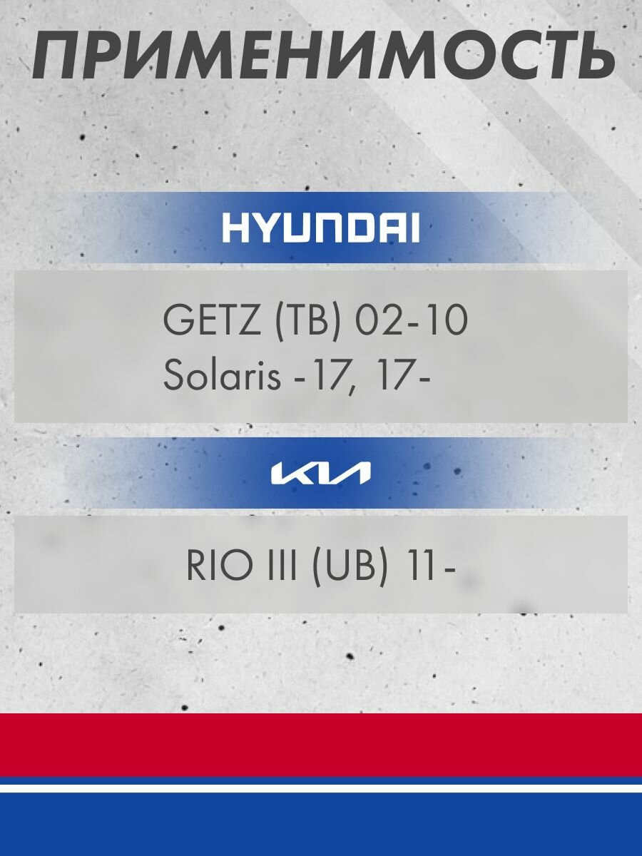 | Модель автомобиля | BYD F3, Changan CS35, Changan CS75, Chery Amulet, Chery Bonus 3, Chery CrossEastar, Chery Fora, Chery IndiS, Chery M11, Chery Tiggo, Chery Tiggo 4, Chery Tiggo 7, Chery Tiggo 7 Pro, Chery Tiggo 8 Pro, Chevrolet Aveo, Chevrolet Cruze, Chevrolet Orlando, Chevrolet Spark, Daihatsu Charade, Daihatsu Sirion, FAW V5, Ford Focus, Ford Focus C-Max, Geely Atlas, Geely Coolray, Geely Emgrand EC7, Geely Emgrand X7, Geely GC6, Geely MK, Geely MK Cross, Geely Monjaro, Geely Otaka, Geely SC7, Geely Tugella, Geely Vision, Great Wall Hover, Great Wall Hover H3, Great Wall Hover H5, Great Wall Hover H6, Great Wall Pegasus, Great Wall Safe, Great Wall Wingle, Haval Dargo, Haval F7, Haval F7X, Haval H8, Haval H9, Haval Jolion, Hyundai Accent, Hyundai Avante, Hyundai Creta, Hyundai Elantra, Hyundai Getz, Hyundai Grand Starex, Hyundai Lantra, Hyundai Matrix, Hyundai Santa Fe, Hyundai Solaris, Hyundai Sonata, Hyundai Starex, Hyundai Terracan, Hyundai Tucson, Hyundai Veloster, Hyundai Verna, Hyundai i20, Hyundai i30, Hyundai i40, Hyundai i40 CW, Hyundai ix35, JAC J7, Kia Carens, Kia Ceed, Kia Cerato, Kia K5, Kia Magentis, Kia Mohave, Kia Optima, Kia Picanto, Kia Rio, Kia Shuma, Kia Sorento, Kia Sorento Prime, Kia Soul, Kia Spectra, Kia Sportage, Lifan Breez, Lifan Cebrium, Lifan Celliya, Lifan Myway, Lifan Smily, Lifan Solano, Lifan X50, Lifan X60, Lifan X70, Mazda 3, Opel Astra J, Opel Cascada, Opel Mokka, Opel Zafira, Peugeot 107, Renault Logan, Renault Megane, Renault Sandero, Renault Symbol, Skoda Fabia, Skoda Rapid, Ssang.Yong Actyon, SsangYong Actyon, SsangYong Actyon Sports, SsangYong Kyron, Tank 300, Toyota Caldina, Toyota Camry, Toyota Corolla, Toyota Corolla Fielder, Toyota Echo, Toyota Funcargo, Toyota Prius, Toyota Vitz, Toyota Yaris, Volvo XC40 |