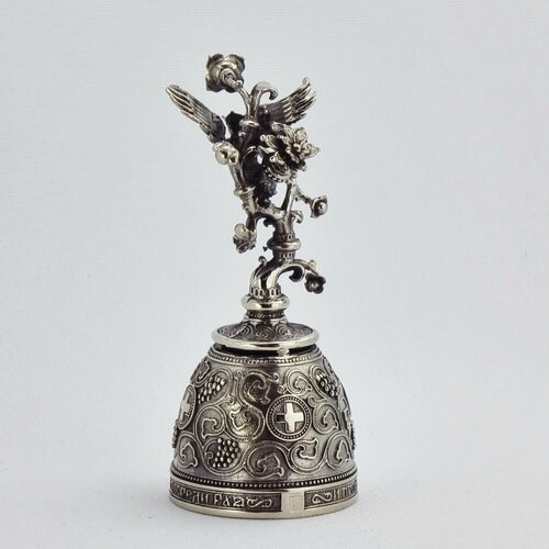 Колокольчик выполнен из сплава бронзы - нейзильбера, который характеризуется коррозионной устойчивостью и повышенной прочностью (по сравнению с бронзой), он так же придает изделию более благородный серебристый цвет.