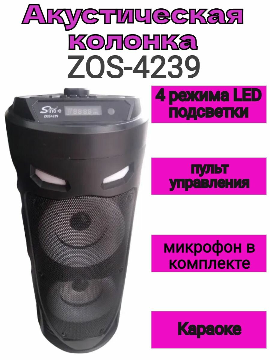 Портативная колонка ZQS-4239 - это отличная бюджетная переносная колонка с качественным и громким звуком, она создана для тех, кто не мыслит отдыха без любимой музыки, отлично подойдёт для любителей походов, отдыха на природе или даче. ВОСПРОИЗВЕДЕНИЕ ЧЕРЕЗ:- Bluetooth- Карты памяти- USB-флешки (TF или Micro SD)- FM-радио- AUX. Гнездо для проводного микрофона. Возможность управления с пульта ДУ.