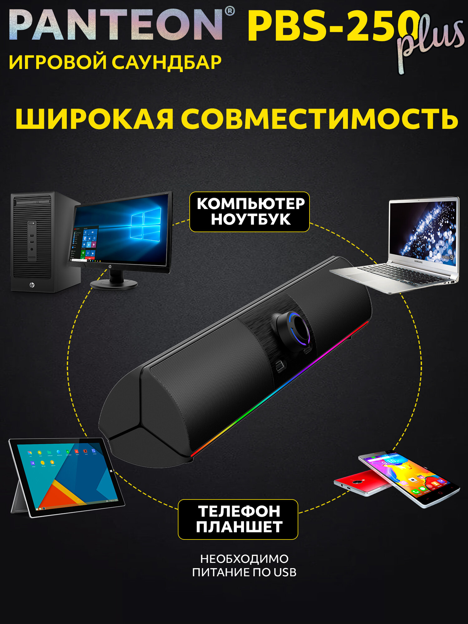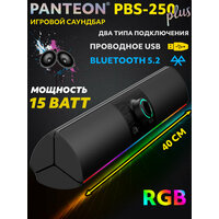 Саундбар PANTEON PBS-250 - отличное качество звука для вашего компьютера. Объемный, глубокий и чистый звук, особенно в играх и фильмах. Саундбар можно разместить под или над монитором, что позволяет сэкономить место на рабочем столе. Саундбар также может использоваться с другими устройствами, такими как смартфоны, планшеты и игровые консоли, что делает его более универсальным и удобным в использовании. Питание PANTEON PBS-250 осуществляется по кабелю USB от соответствующего порта ПК или зарядки для смартфона. Настройка басов Всего доступно 4 различных уровня низких частот. Переключаться между уровнями можно при помощи сенсорных кнопок на верхней панели. Стильный внешний вид и красивая подсветка будет радовать глаз. Режимы работы подсветки 3 режима светомузыки. Динамические режимы. Работают в такт с воспроизводимой музыкой. 6 однотонных режимов. Фиолетовый, красный, синий, желтый, белый, зеленый. 3 режима RGB. Независимые динамические многоцветные режимы свечения. Переключение режимов осуществляется циклично при помощи сенсорной кнопки на верхней панели саундбара. Всего доступно 12 режимов + полное выключение подсветки. ДВА типа подключения Подключать саундбар к устройствам можно через кабель USB или по беспроводной технологии Bluetooth. Совместимость зависит от технических характеристик устройства, к которому подключается саундбар. Возможность передачи звука по USB или Bluetooth уточняйте у производителя устройства, к которому вы подключаете саундбар. Для работы по Bluetooth-каналу необходимо подключить саундбар к источнику питания (USB-порту ПК/ноутбука или зарядному устройству для смартфона).