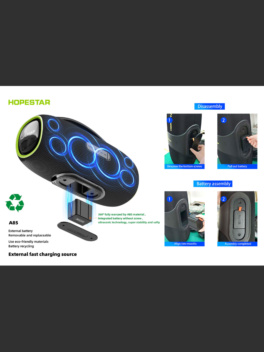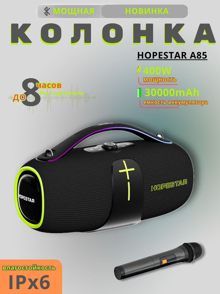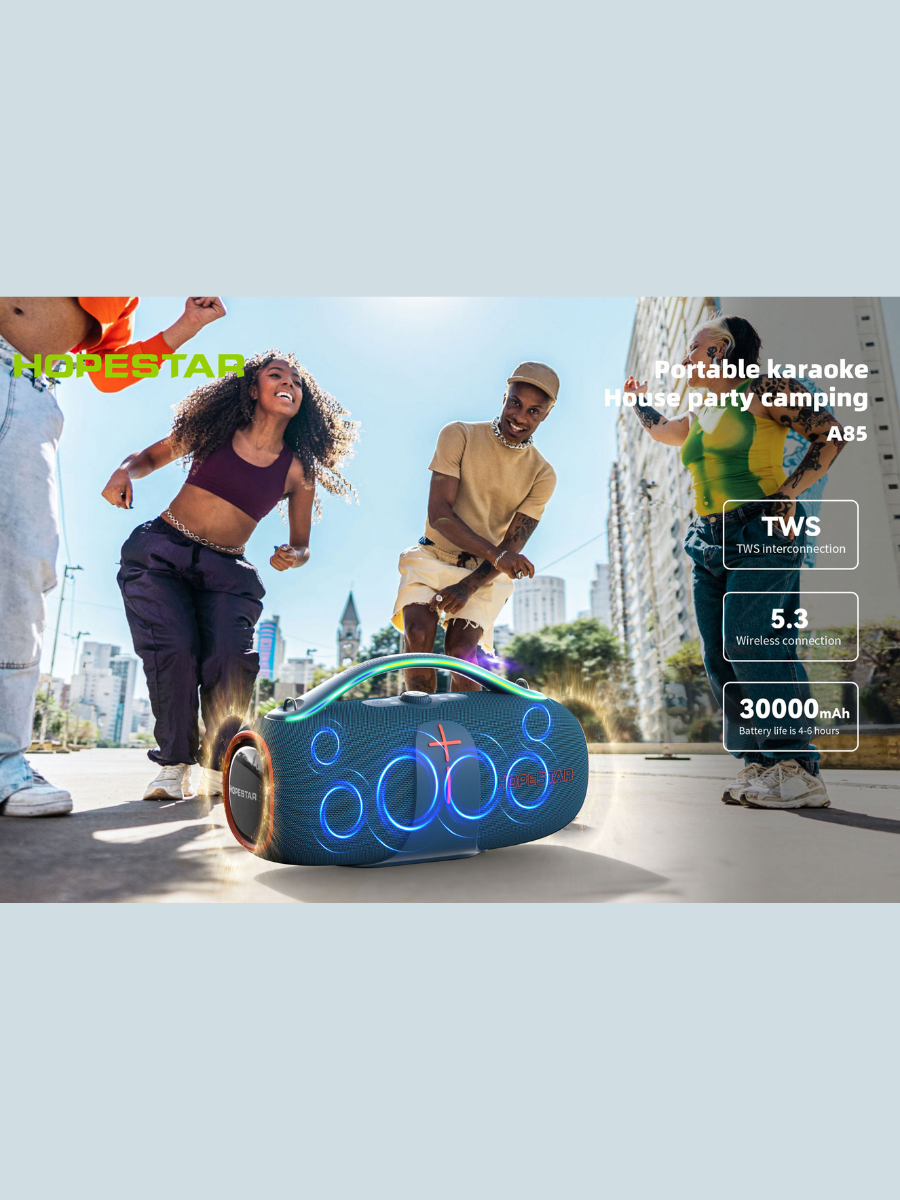Портативная стереосистема Хопстар А86 подходит детям и взрослым для праздников, игр, песен, игровых спортивных развлечений в школе, детских дискотек, караоке вечеров с цветомузыкой, домашних вечеринок в компании, семейных встреч, воспроизведения любимых композиций и лучших треков.